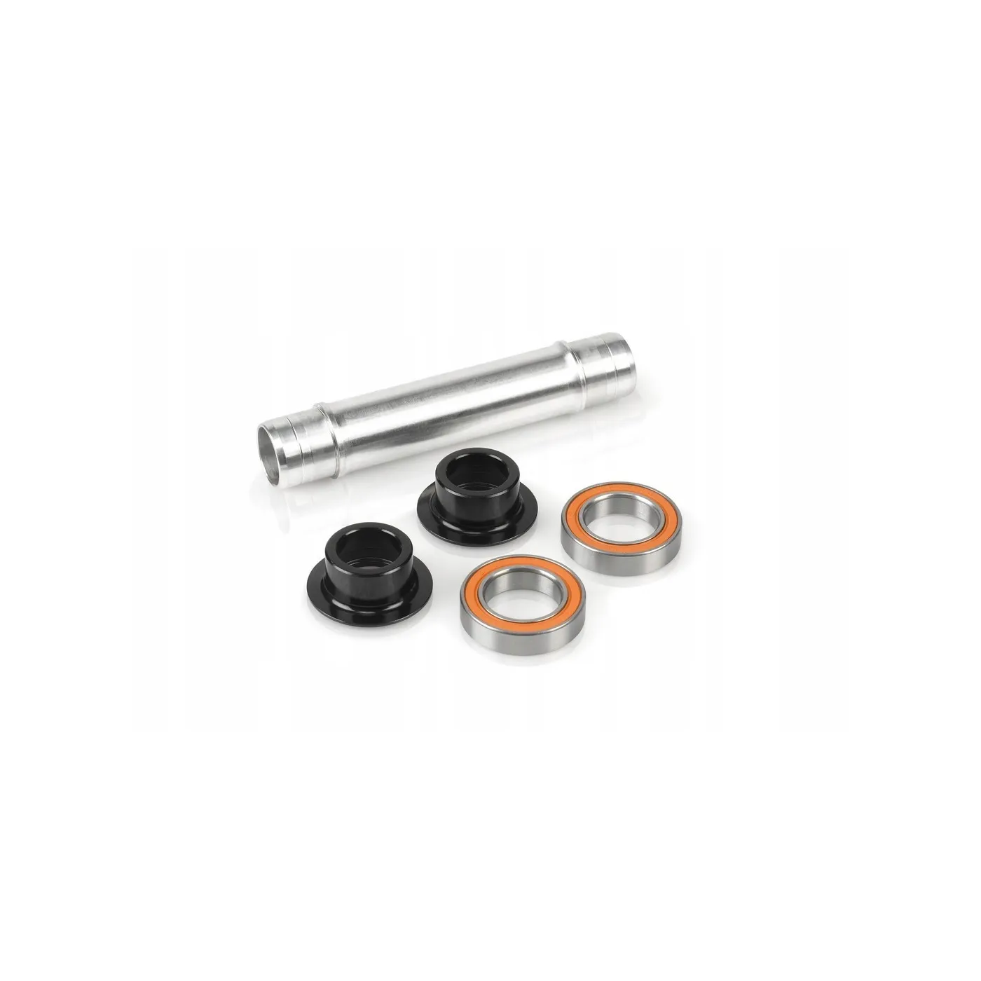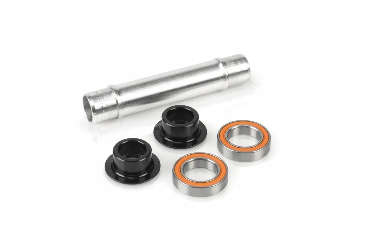 Zestaw naprawczy piasty przedniej (110 mm, Ø15 mm przez oś) składający się z osi, łożyska i zaślepek. Zastosowanie typowo MTB.