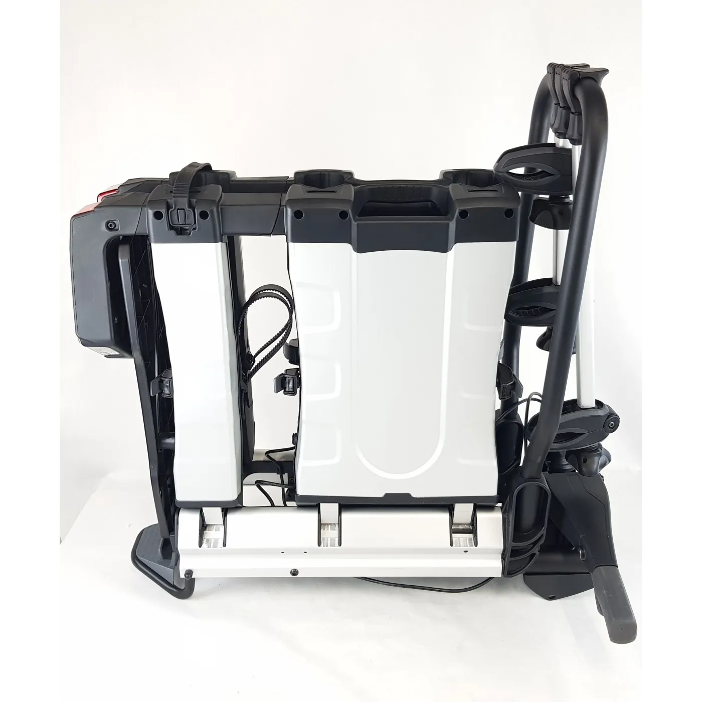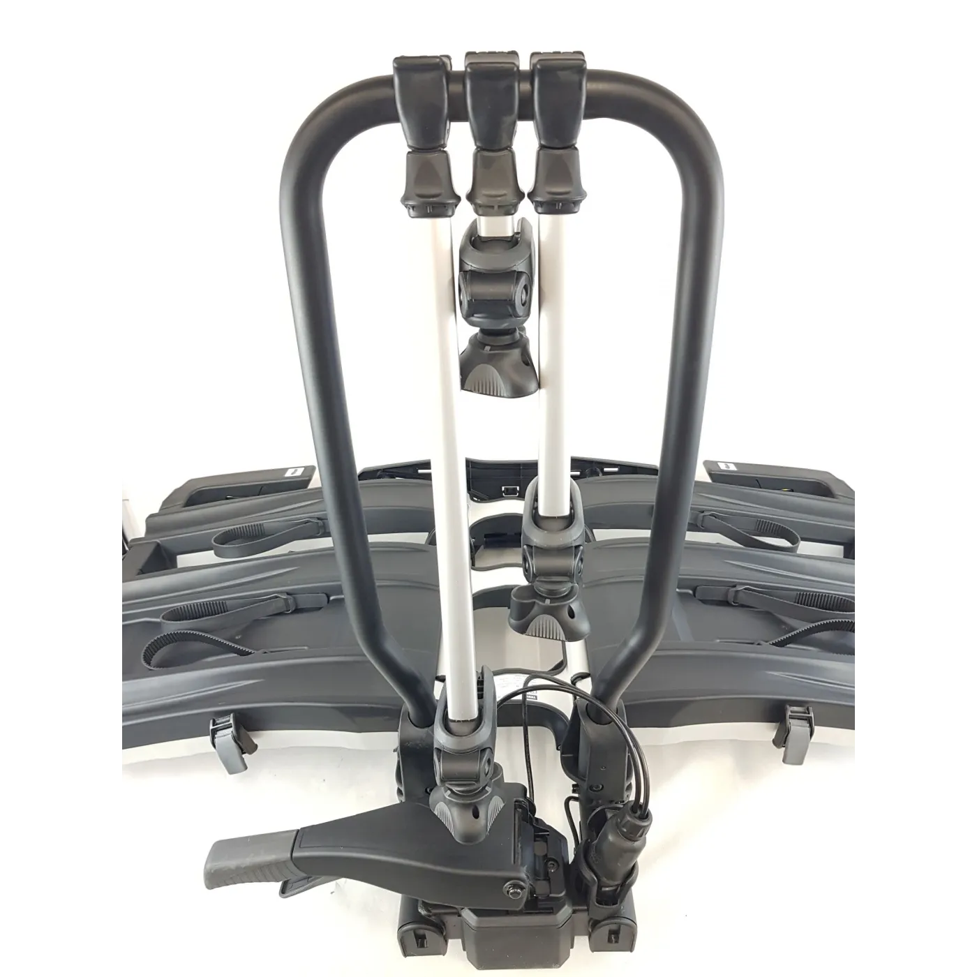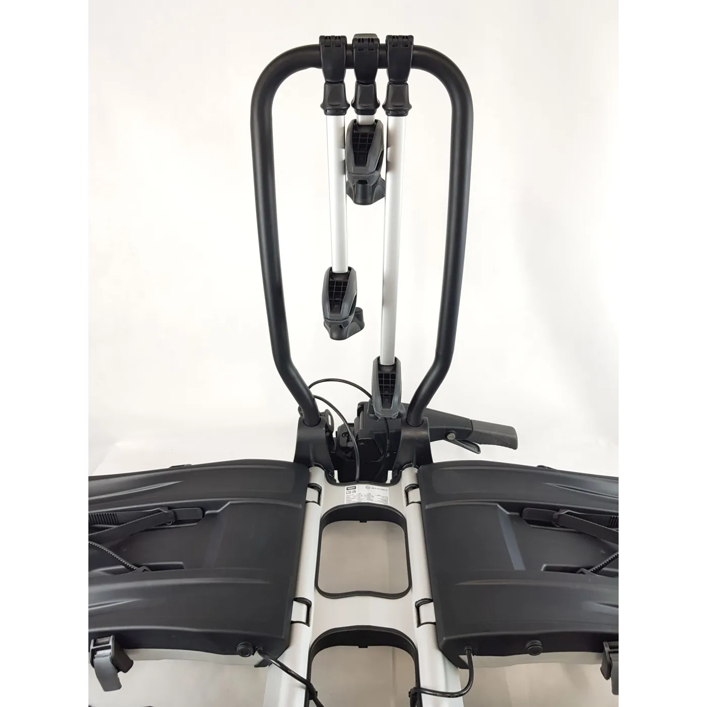 Thule EasyFold XT3 to w pełni składany bagażnik rowerowy o dużej ładowności pozwalającej na przewożenie trzech jednośladów na raz – w tym cięższych modeli górskich, fat bike’ów czy elektrycznych. Maksymalna masa roweru, który można zamontować to 30 kg, a średnica ramy nie może być większa nić 80 mm. Rowery przytwierdzane do bagażnika są stabilne i bezpiecznie dzięki 3-punktowemu montażowi – pas z klamrą na każde koło oraz pojedyncze ramie z gałką AcuTight z regulacją siły mocowania na ramie. Każdy rower zabezpieczany jest również zamkiem na kluczyk w systemie One Key.