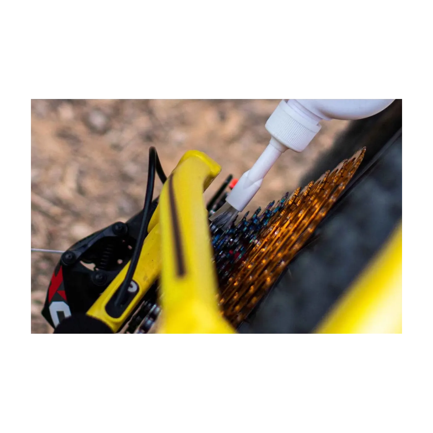 Przed aplikacją podłóż karton pod napęd. Ustaw łańcuch na najmniejszej zębatce i nanoś preparat szczoteczką, obracając korbą do tyłu. Odczekaj 15–20 minut, aż zabrudzenia zostaną rozpuszczone, a następnie pozostaw preparat na 6–8 godzin do całkowitego odparowania rozpuszczalnika. W razie silnego zabrudzenia powtórz proces.