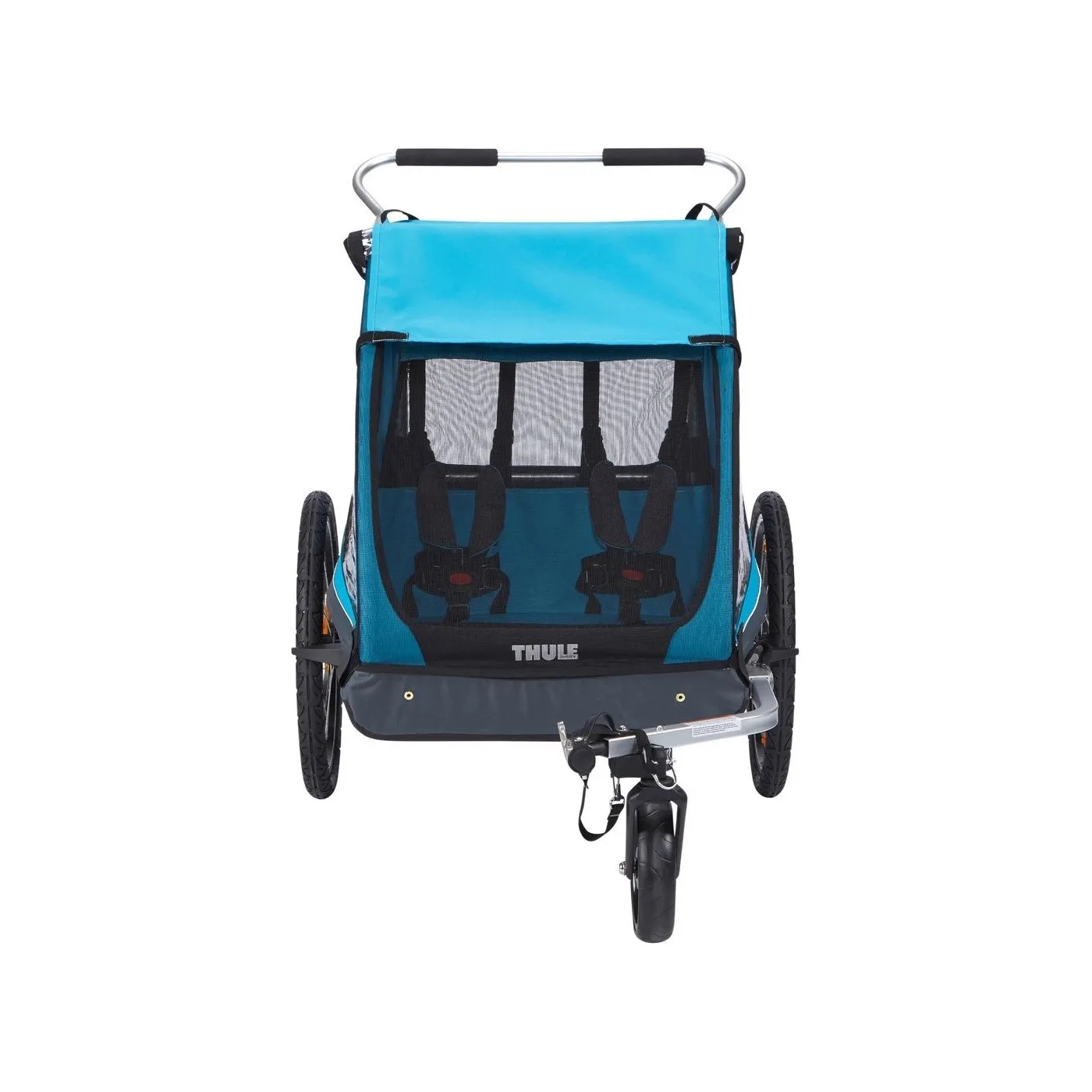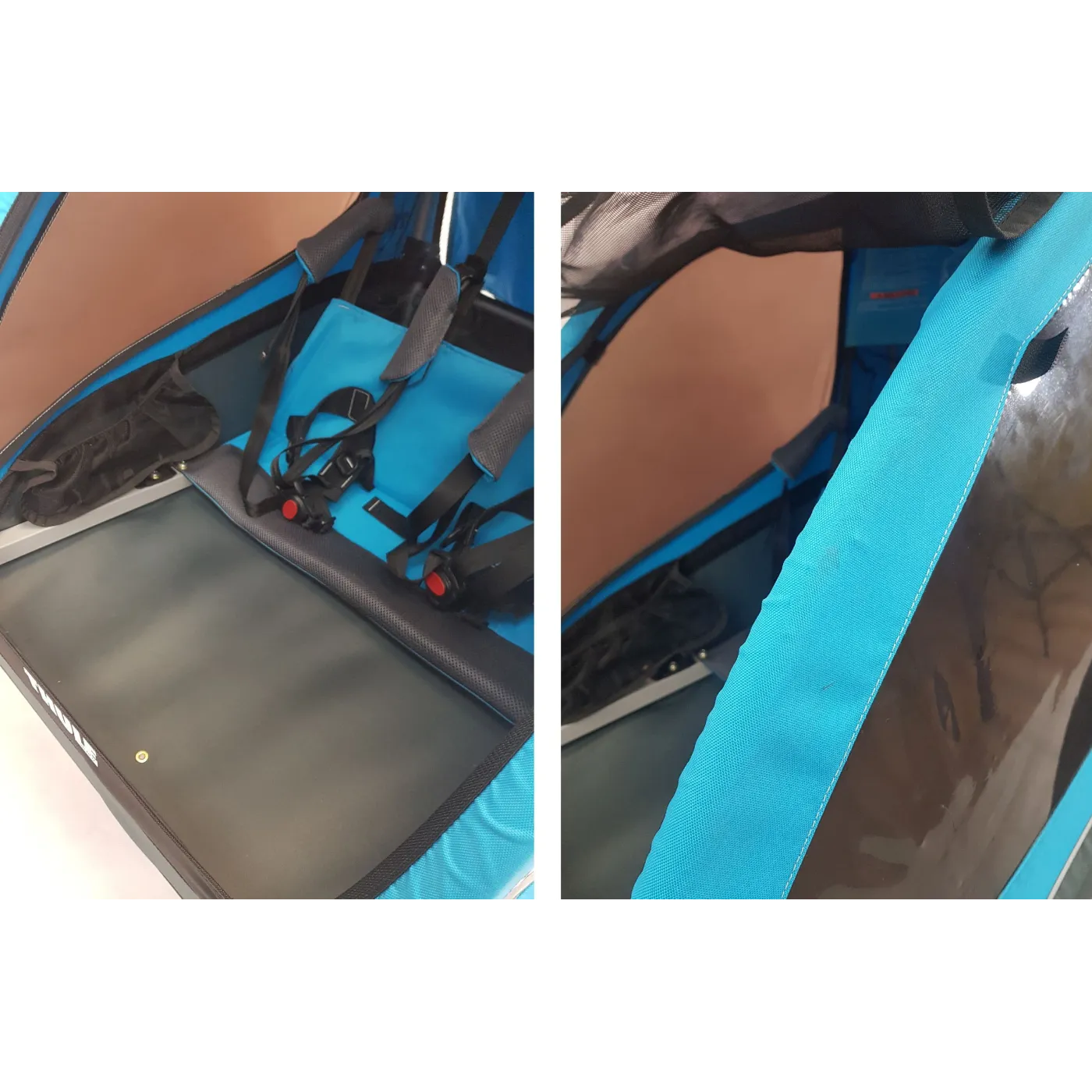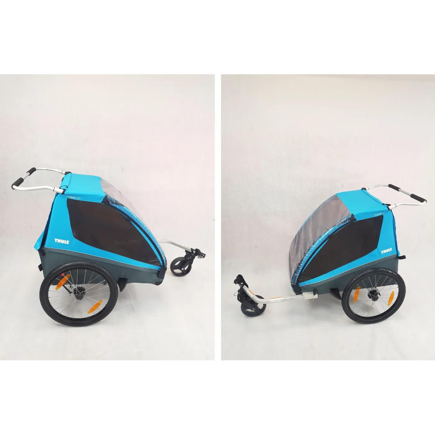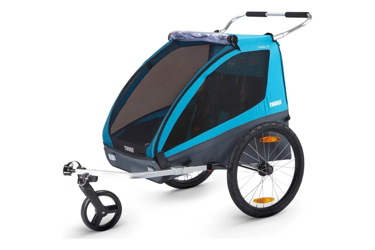 W przyczepce możesz wozić jedno lub dwójkę dzieci. Po dotarciu do celu możesz łatwo przekształcić ją w wózek spacerowy. Ponadto posiada przestrzeń na zakupy czy niezbędne rzeczy. Wyposażona jest w okna boczne oraz przednie zabezpieczone moskitierą. Przednie okno posiada również folię przeciwdeszczową.