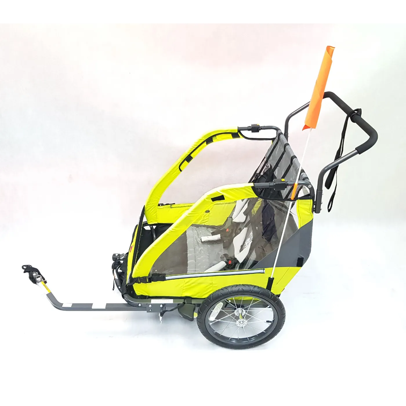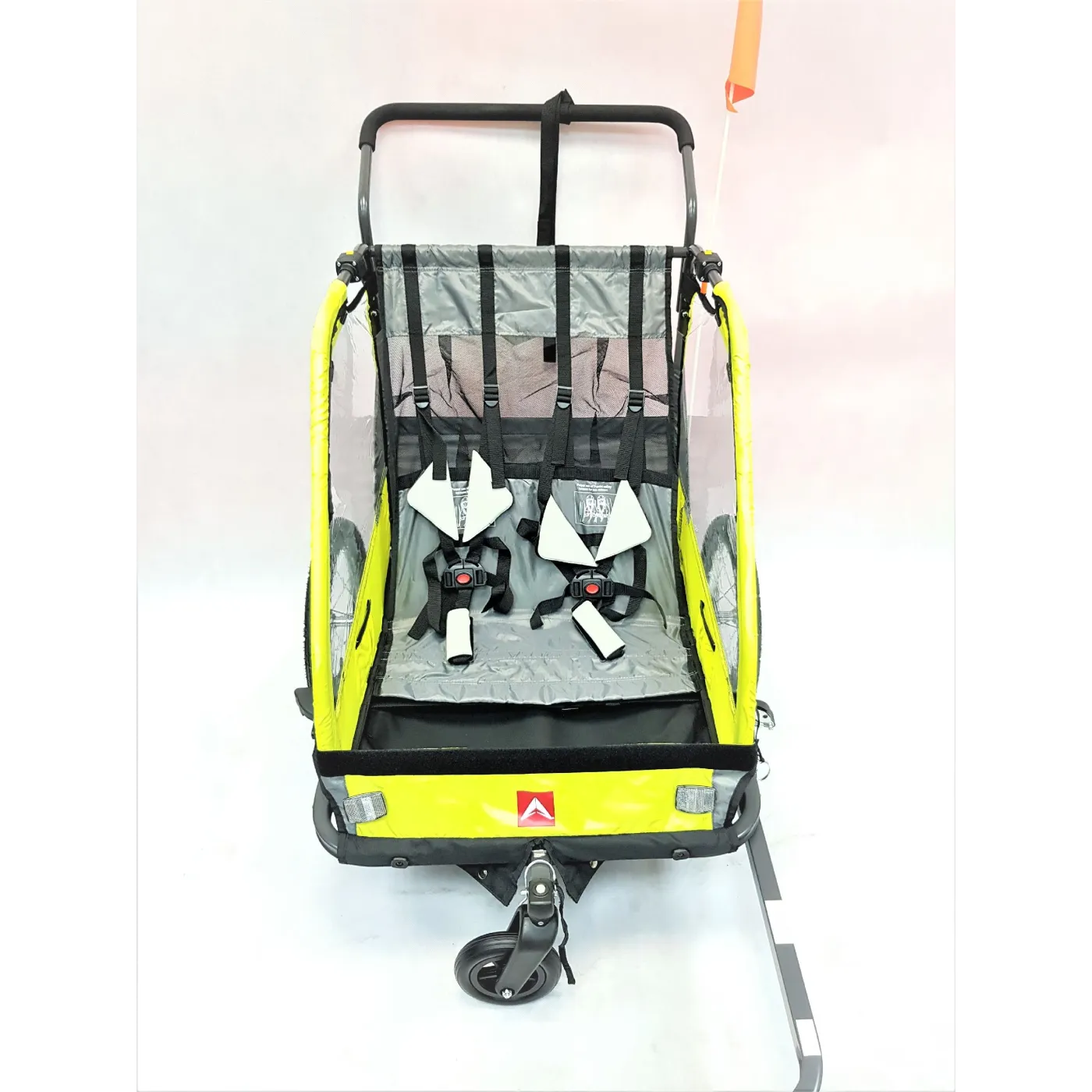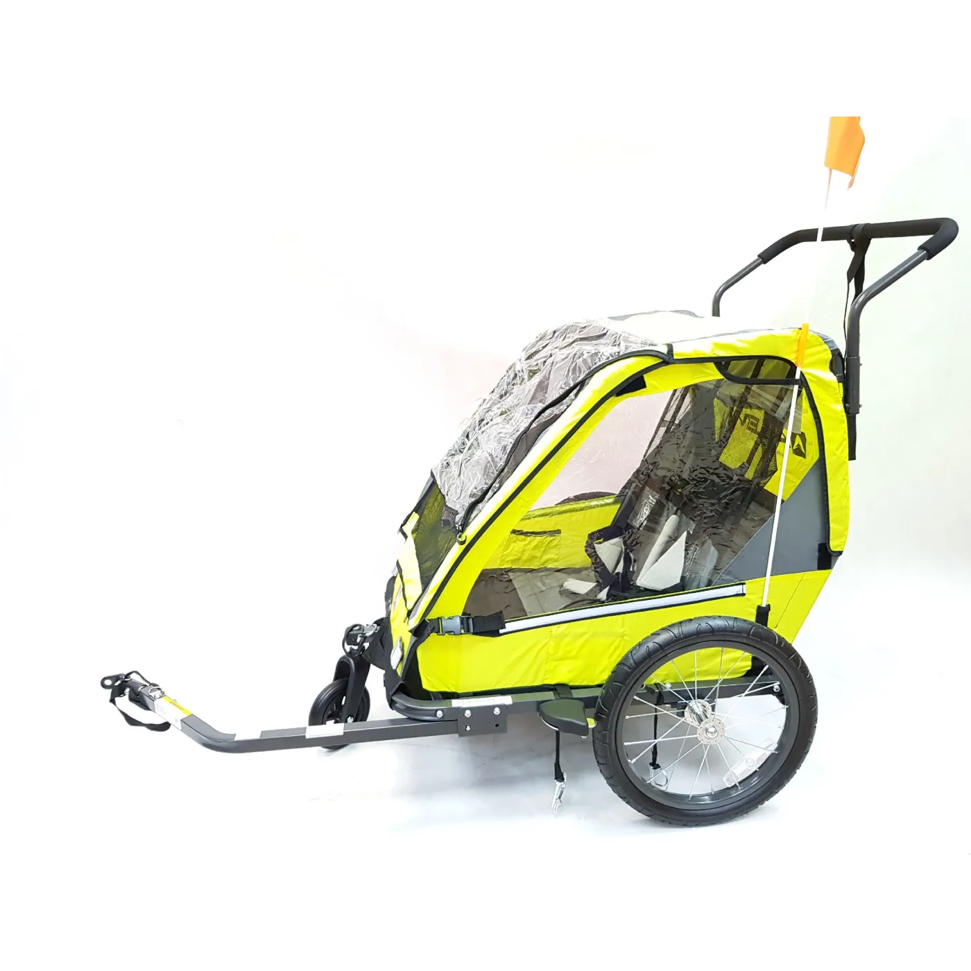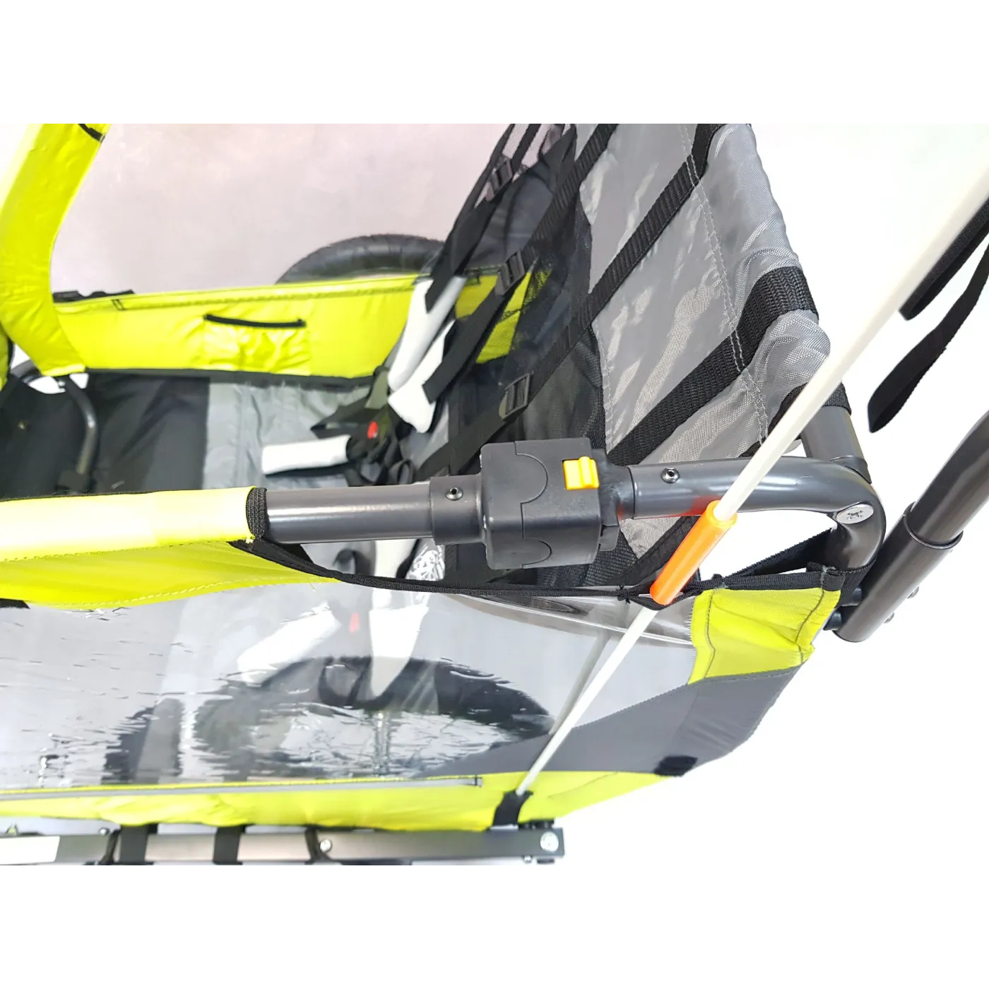 W przyczepce możesz wozić jedno lub dwójkę dzieci. Wyposażona jest w okna boczne oraz przednie zabezpieczone moskitierą i folią przeciwdeszczową.