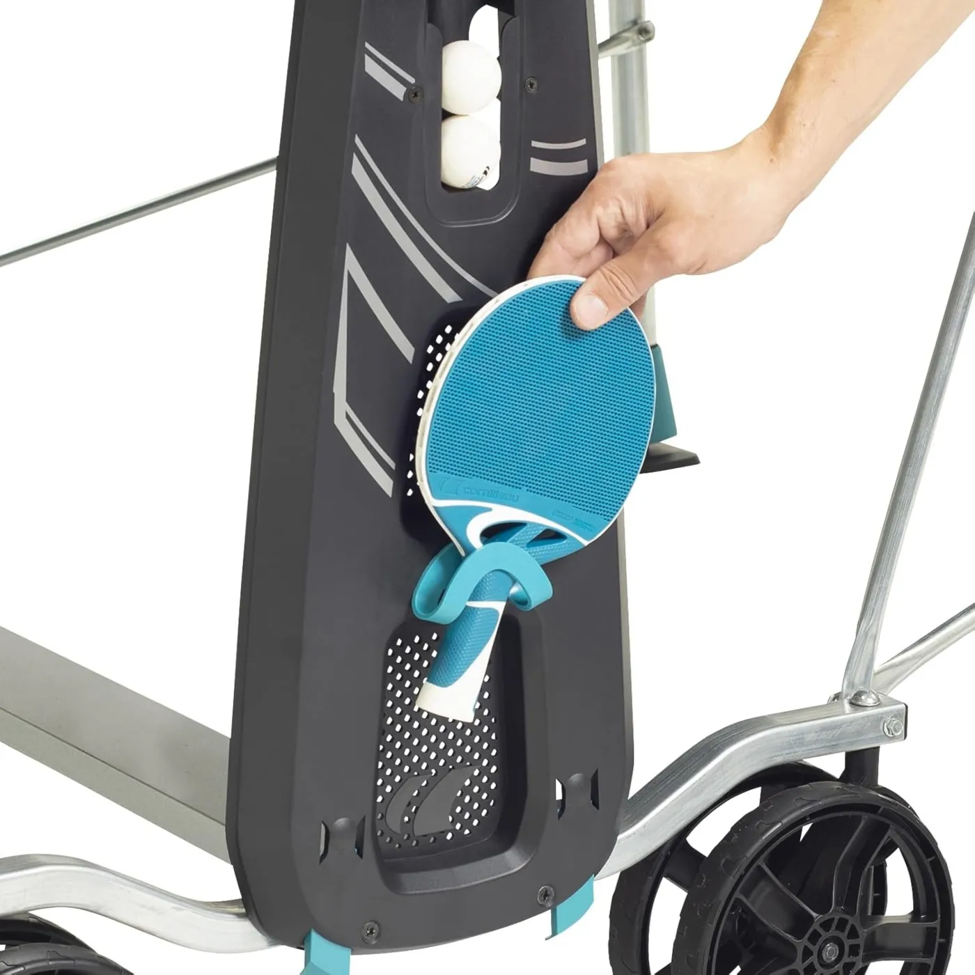 🔧 Stół wyposażony został w regulowaną siatkę z intuicyjnym systemem napięcia oraz ruchome stopki poziomujące, które umożliwiają idealne wypoziomowanie stołu nawet na nierównych powierzchniach. Duże podwójne koła z hamulcami sprawiają, że transport stołu po trawie, schodach czy żwirze nie stanowi problemu, a stabilność podczas gry lub przechowywania jest zawsze zachowana.