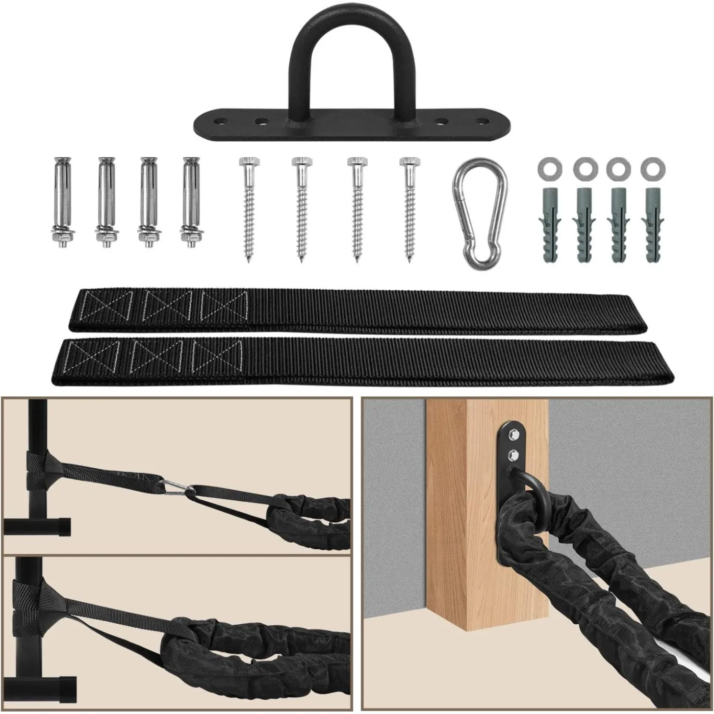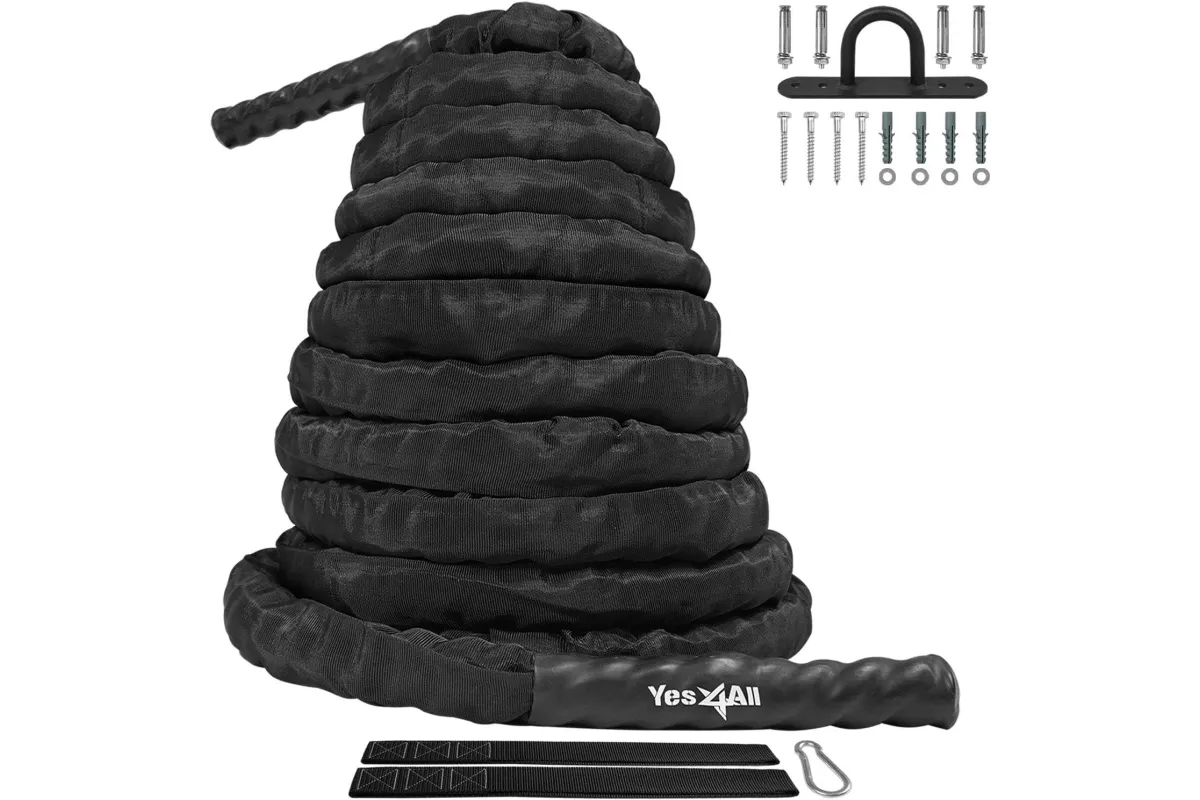 4All Battle Rope to wytrzymała i praktyczna lina fitness, wykonana z wysokiej jakości materiału polidacronowego z nylonową powłoką na zewnątrz. Uchwyty mają długość 10 cali, zapewniając dużo miejsca do wygodnego chwytania uchwytów. Są również termokurczliwe, aby zapobiec poślizgowi i zapewniają dodatkową ochronę dłoni. W zestawie znajduje się również kotwica i pasek, które zapewniają inny sposób treningu, pomagając urozmaicić ćwiczenia i zwiększyć bezpieczeństwo, utrzymując linę stabilnie na miejscu.