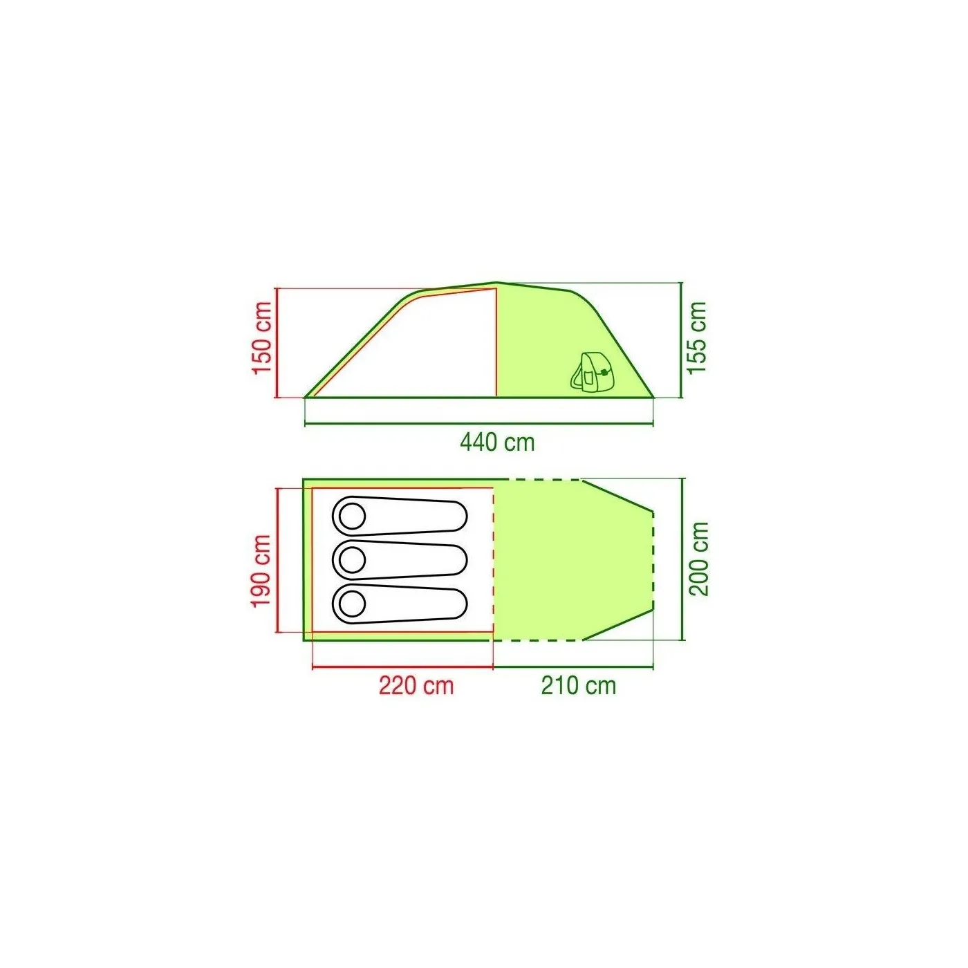 - Powierzchnia namiotu: 8 m2 (sypialnia 4,2 m2, przedsionek 3,8 m2)