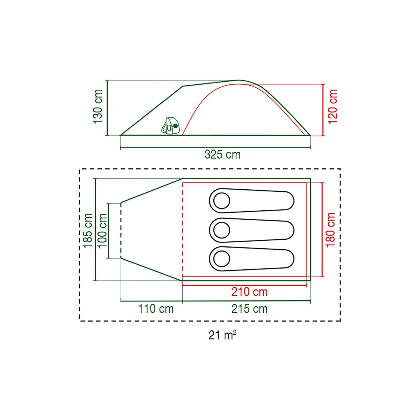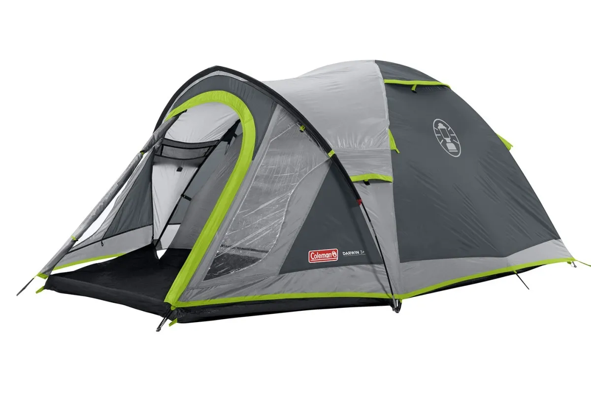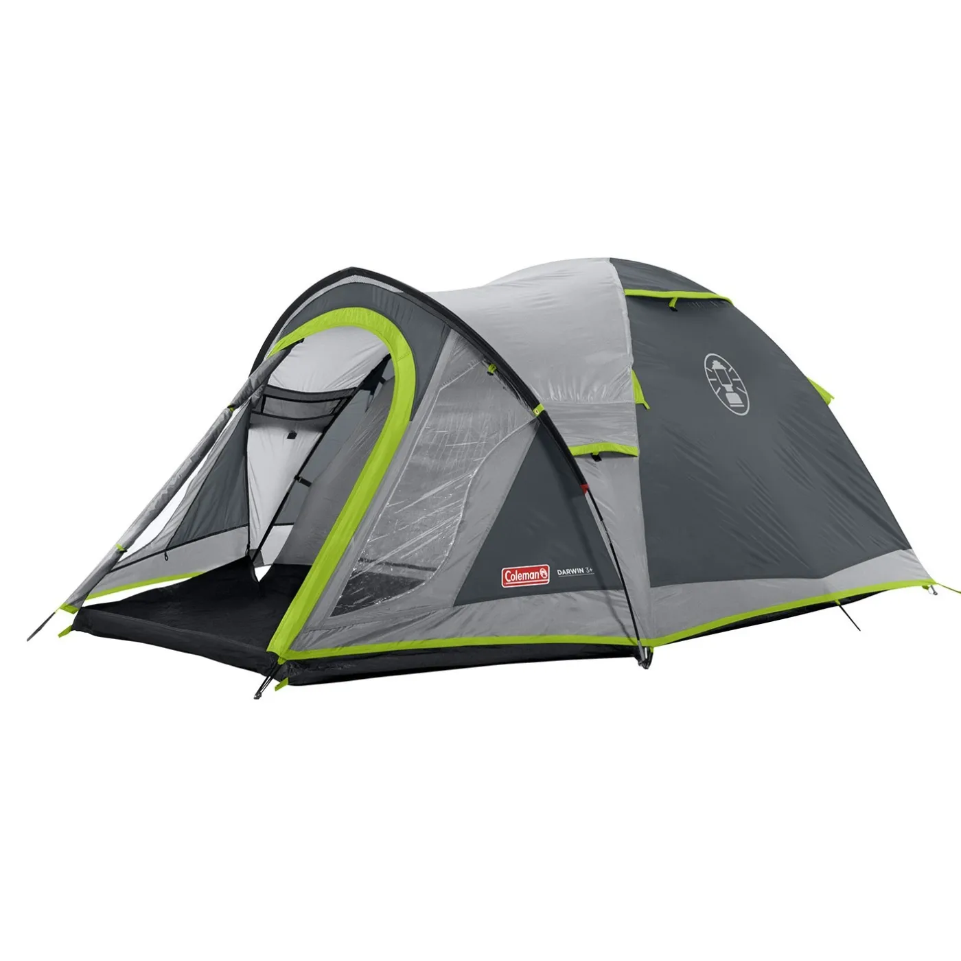 Namiot trzyosobowy Coleman Darwin 3 Plus - grey/green to prosta konstrukcja typu igloo wzbogacona o przestronny przedsionek, który uzyskano poprzez dołożenie trzeciego elementu stelaża. Przedsionek posiada zintegrowaną podłogę oraz zasłaniane panele okienne wykonane z PCV, które rozjaśniają wnętrze lub zwiększą poczucie prywatności. Model posiada obszerną sypialnię, która bez trudu pomieści trzy osoby. Nieprzemakalność tropiku wykonanego z poliestru i pokrytego laminatem z poliuretanu wynosi 3000 mm słupa wody.