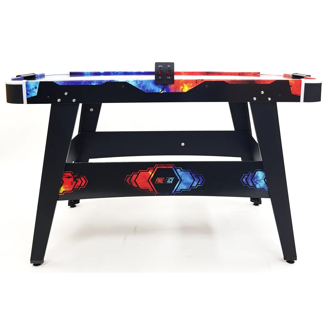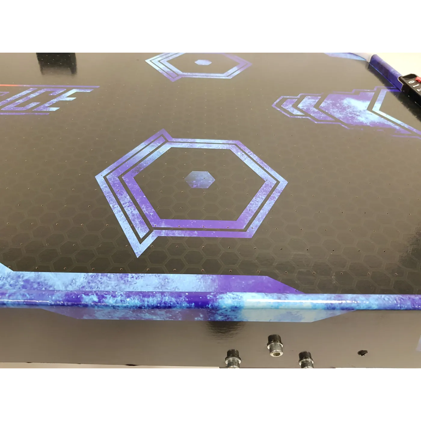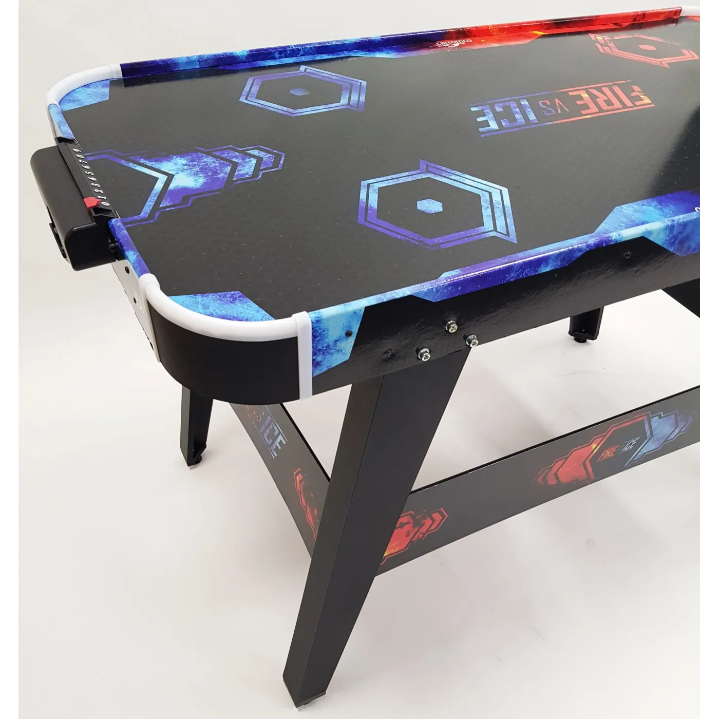 Carromco AIRHOCKEY to wyjątkowy stół do gry w cymbergaja z podświetlanymi diodami LED. Konstrukcja nóg w kształcie litery L z poprzecznymi podporami dookoła i śrubami regulacyjnymi zapewnia maksymalną stabilność i wyrównanie nierówności podłoża. Nowoczesny stół wyróżnia się czarnym polem, kolorową grafiką fire & ice i podświetlanymi diodami LED.