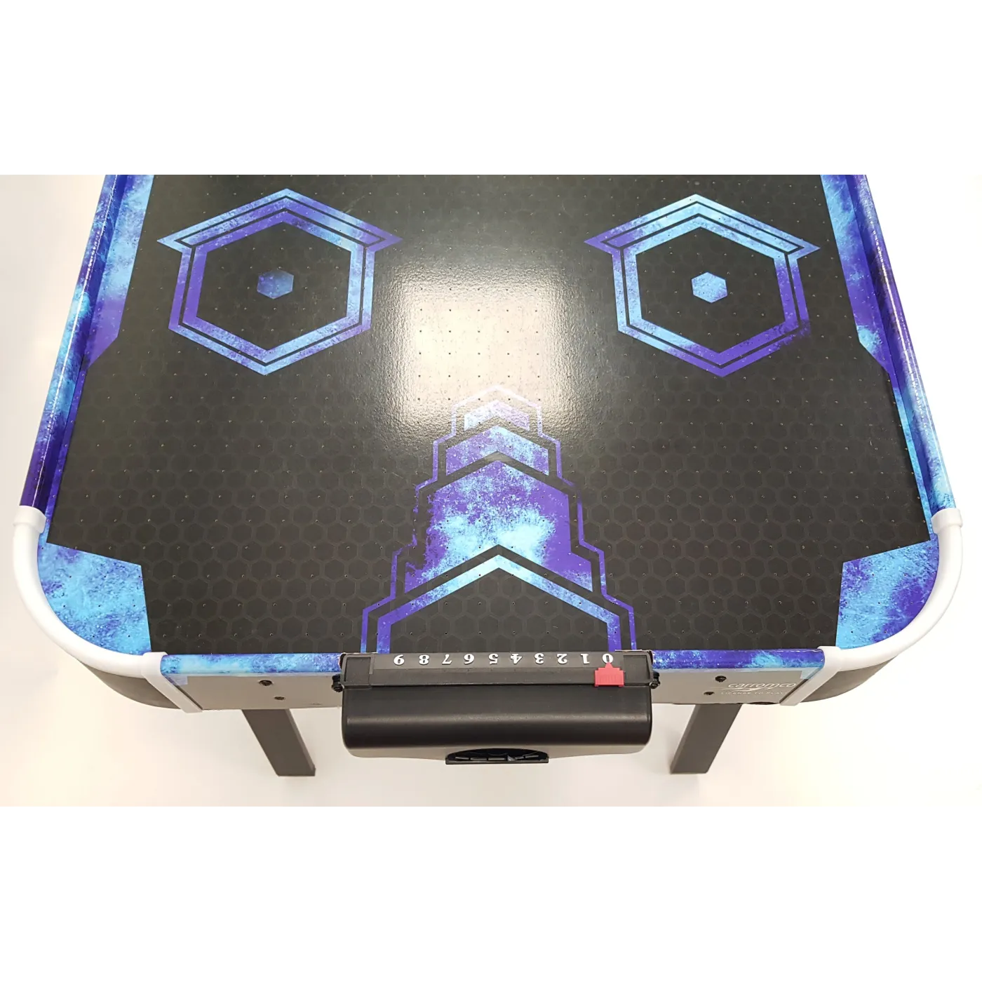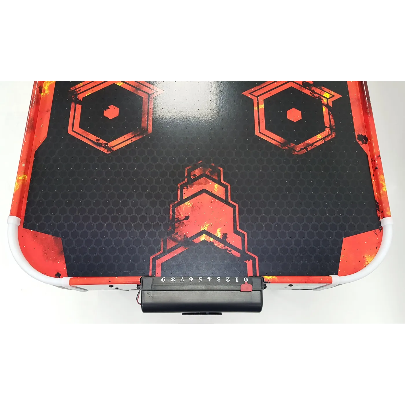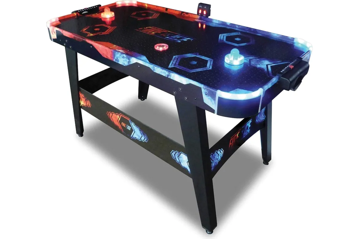 Carromco AIRHOCKEY to wyjątkowy stół do gry w cymbergaja z podświetlanymi diodami LED. Konstrukcja nóg w kształcie litery L z poprzecznymi podporami dookoła i śrubami regulacyjnymi zapewnia maksymalną stabilność i wyrównanie nierówności podłoża. Nowoczesny stół wyróżnia się czarnym polem, kolorową grafiką fire & ice i podświetlanymi diodami LED.