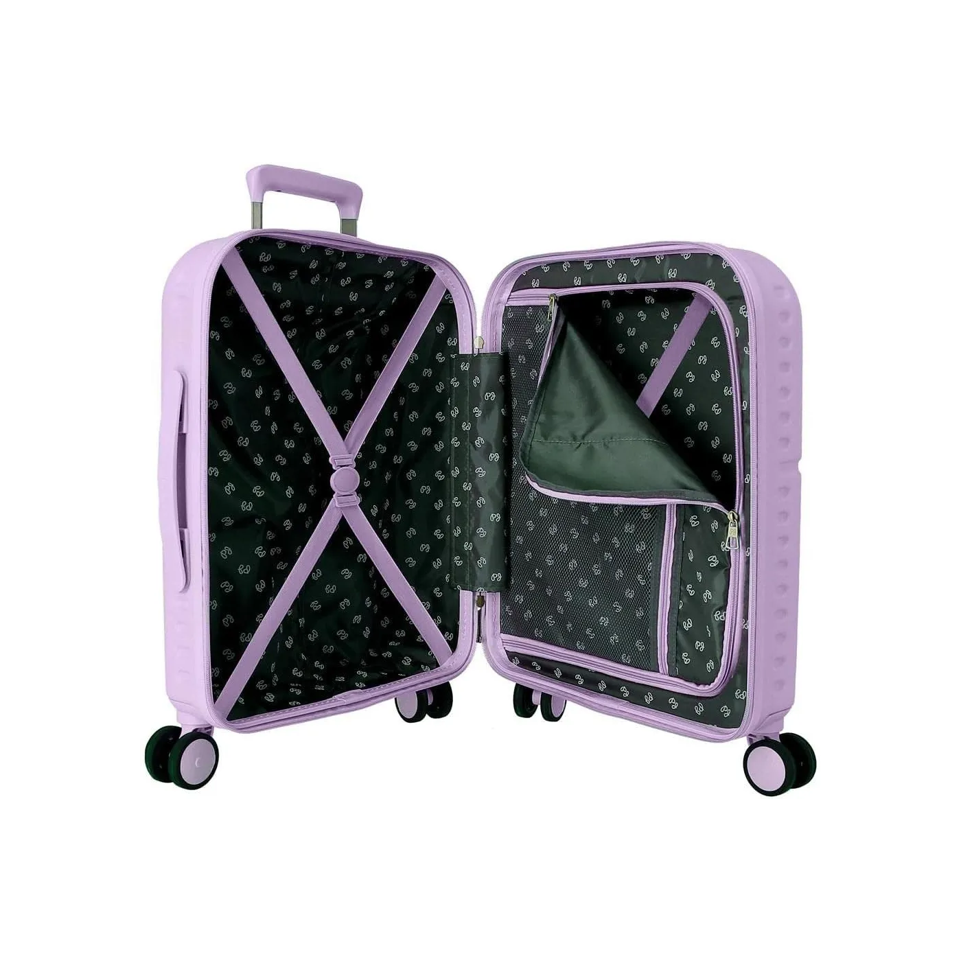 Wnętrze walizki zostało starannie zaprojektowane, by zapewnić maksymalne wykorzystanie przestrzeni. Znajdują się w niej dwie praktyczne przegródki, kieszeń na zamek oraz elastyczne zapięcia, które ułatwią organizację bagażu. Dodatkowo, cztery wielokierunkowe, podwójne koła obrotowe umożliwiają płynne skręcanie i łatwe manewrowanie na lotnisku czy w hotelu.