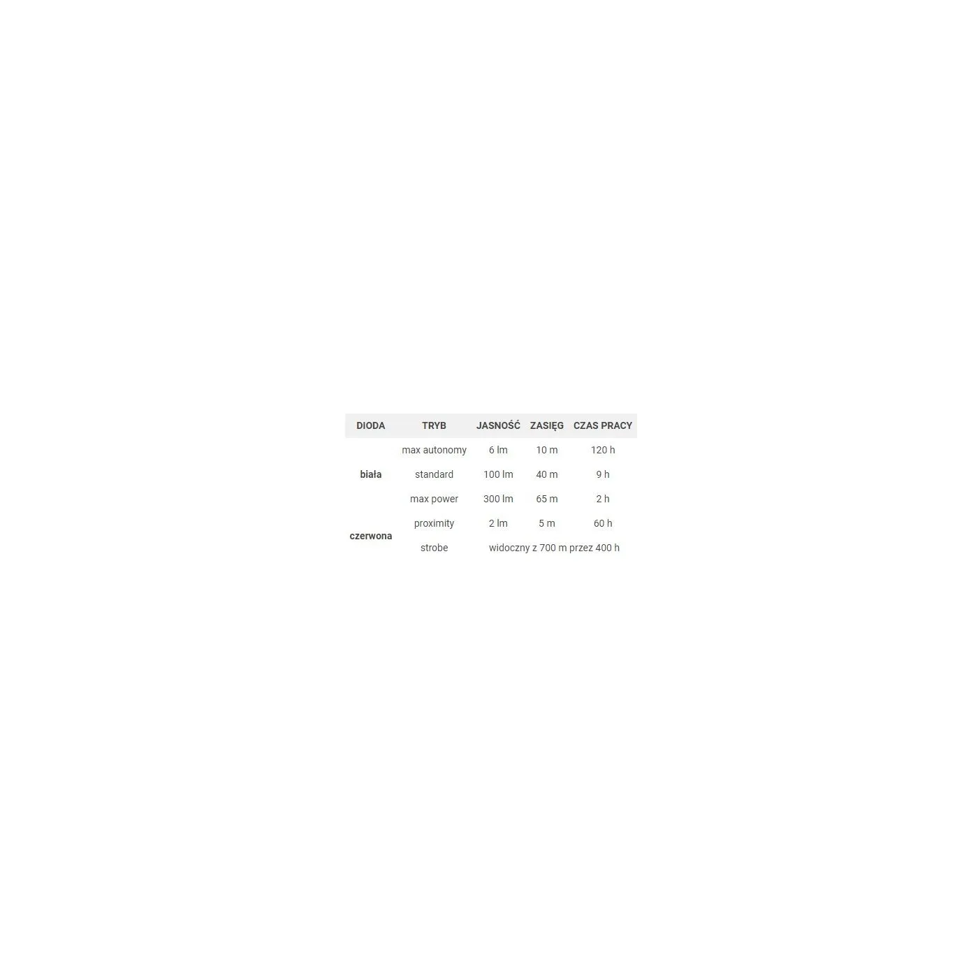 Białą dioda emituje strumień światła o maksymalnej mocy 300 lumenów i świetnie sprawdzi się podczas większości zadań biwakowych. Natomiast czerwona dioda idealnie sprawdzi się podczas polowania lub tropienia, gdzie nie możemy pozwolić sobie na użycie światła białego.