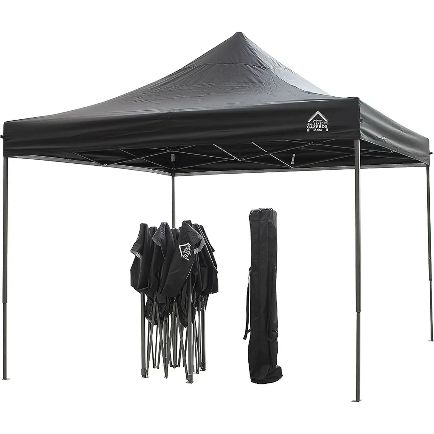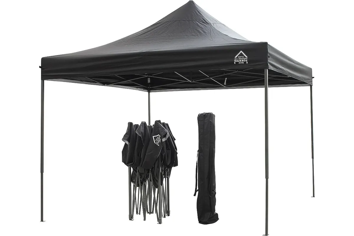 Składany pawilon ogrodowy All Seasons jest w pełni wodoodporny. Czarna matowa rama wykonana ze stali malowanej proszkowo jest nierdzewna, a wiele wsporników zapewnia dodatkową stabilność z trzema różnymi ustawieniami wysokości. Montaż pawilonu jest bardzo prosty, żadne pręty nie zatrzaskują się na miejscu, wystarczy wyciągnąć nogi, przykryć ramę pokrywą (tylko za pierwszym razem można zamontować sufit do przyszłych zastosowań), ustawić nogi na żądaną wysokość i mocno zacisnąć. Jest to bardzo proste i zajmuje tylko kilka minut, aby w pełni zbudować altankę. Ten model jest idealny do stosowania na trawnikach, tarasach, czy nawet piasku.