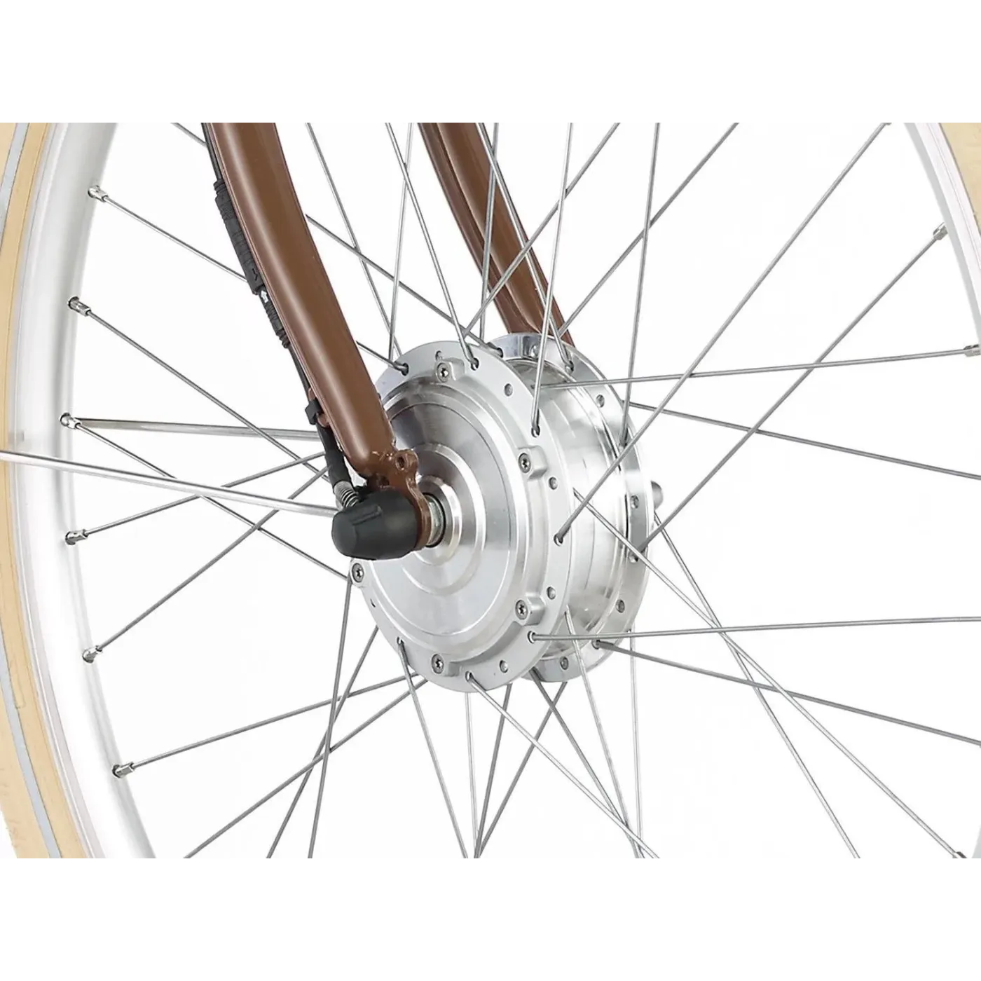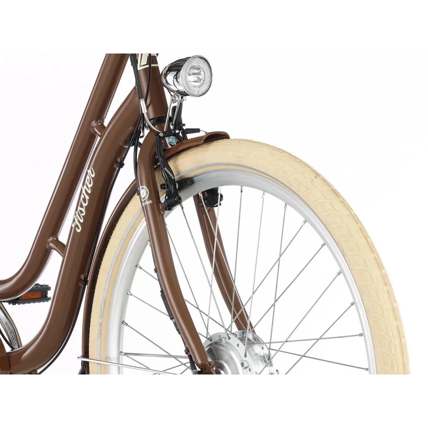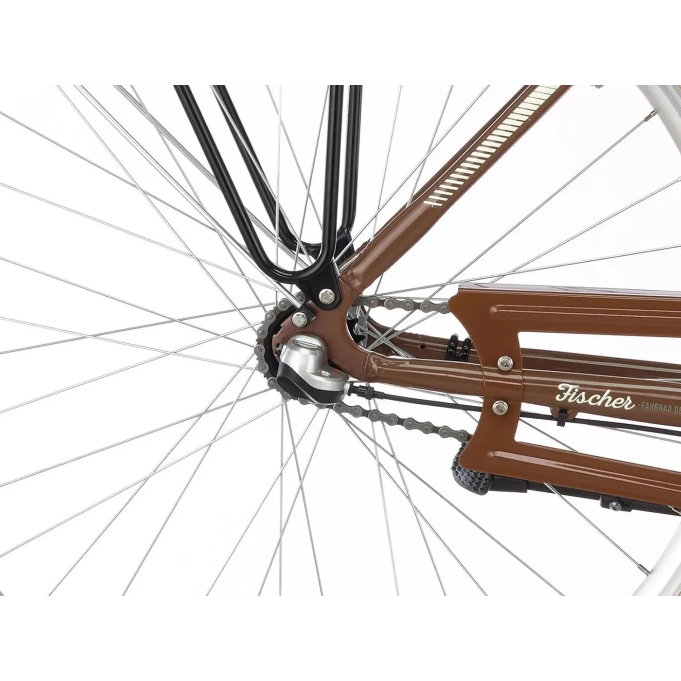 Wyjątkową cechą roweru retro Fischer jest akumulator przykryty praktycznym koszem, a kompaktowy przedni silnik jest prawie niewidoczny. Pozycja siedząca jest przyjemnie wyprostowana i zapewnia duży komfort dzięki miękkiemu żelowemu siodełku i zakrzywionej kierownicy. Piasta trzybiegowa i hamulec V-brake to klasyczne i sprawdzone rozwiązanie. Nie zabrakło również udogodnień, takich jak stałe światło LED, osłona łańcucha oraz stopka.