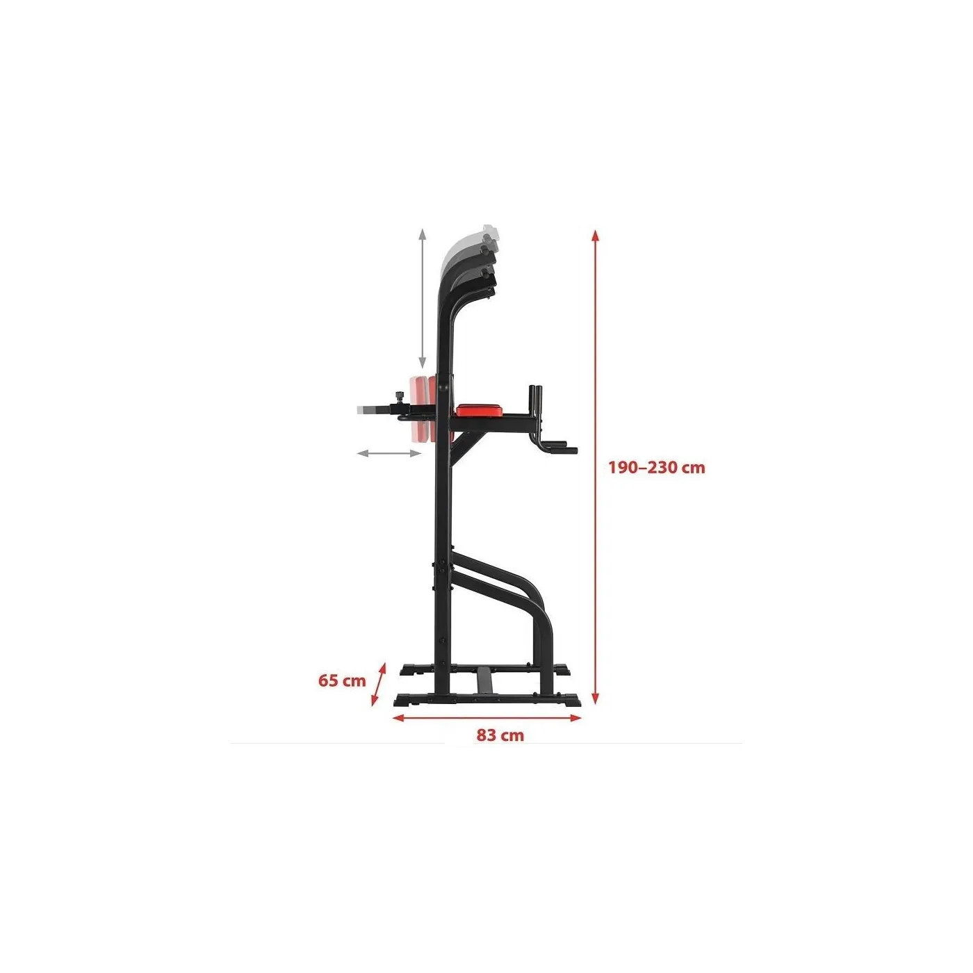 Stacja podciągowa uznanej marki Ultrasport zamieni Twój dom w domową siłownię. Główną cechą stacji jest jej wielofunkcyjność. Umożliwia wykonywanie wielu rodzajów ćwiczeń m.in. podciąganie czy dipy. Korzystanie ze stacji wpłynie korzystnie na rozbudowę mięśni - głównie górnej partii ciała. Podpórki ramion oraz pleców są wykonane z miękkiej pianki, która zapewnia większy komfort treningu. Wpływ na wspomniany komfort ma także możliwość regulacji wysokości, z kolei solidna stalowa konstrukcja z antypoślizgowymi nóżkami zapewnia maksymalną stabilność i bezpieczeństwo podczas wykonywania wszystkich ćwiczeń.
