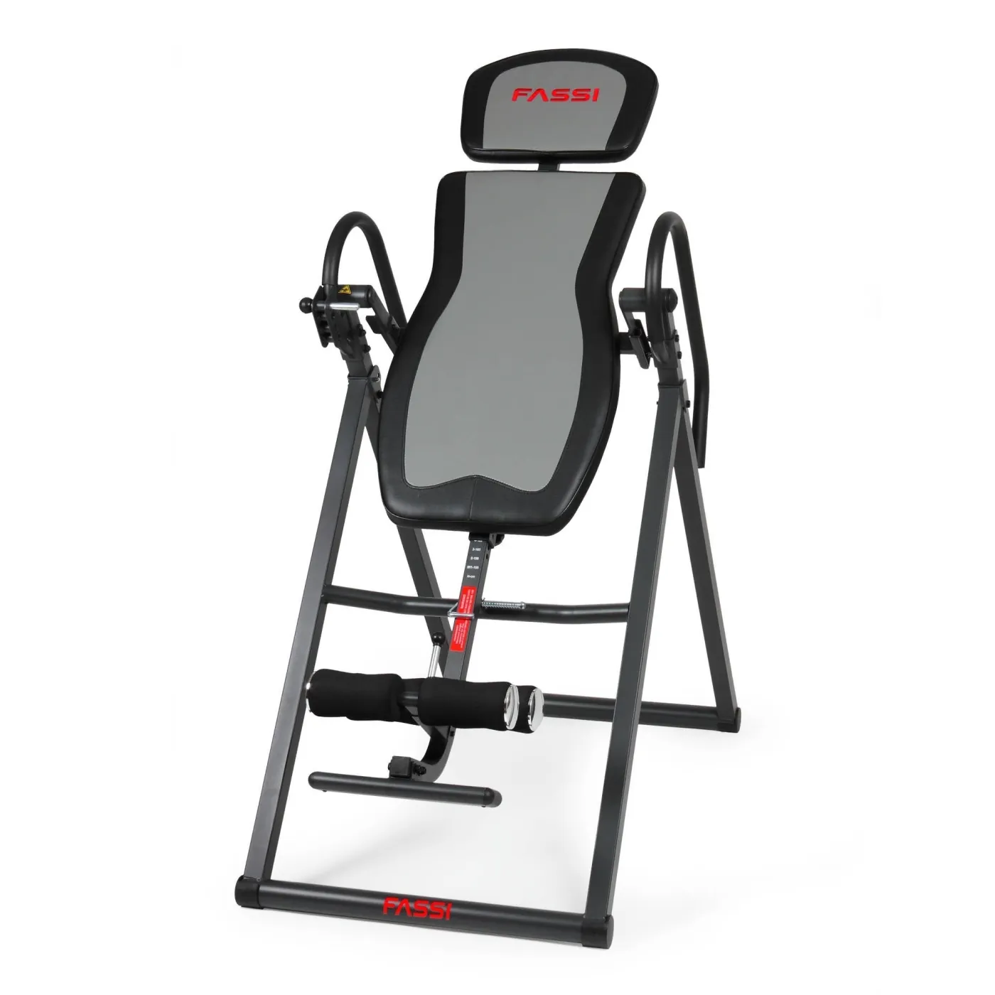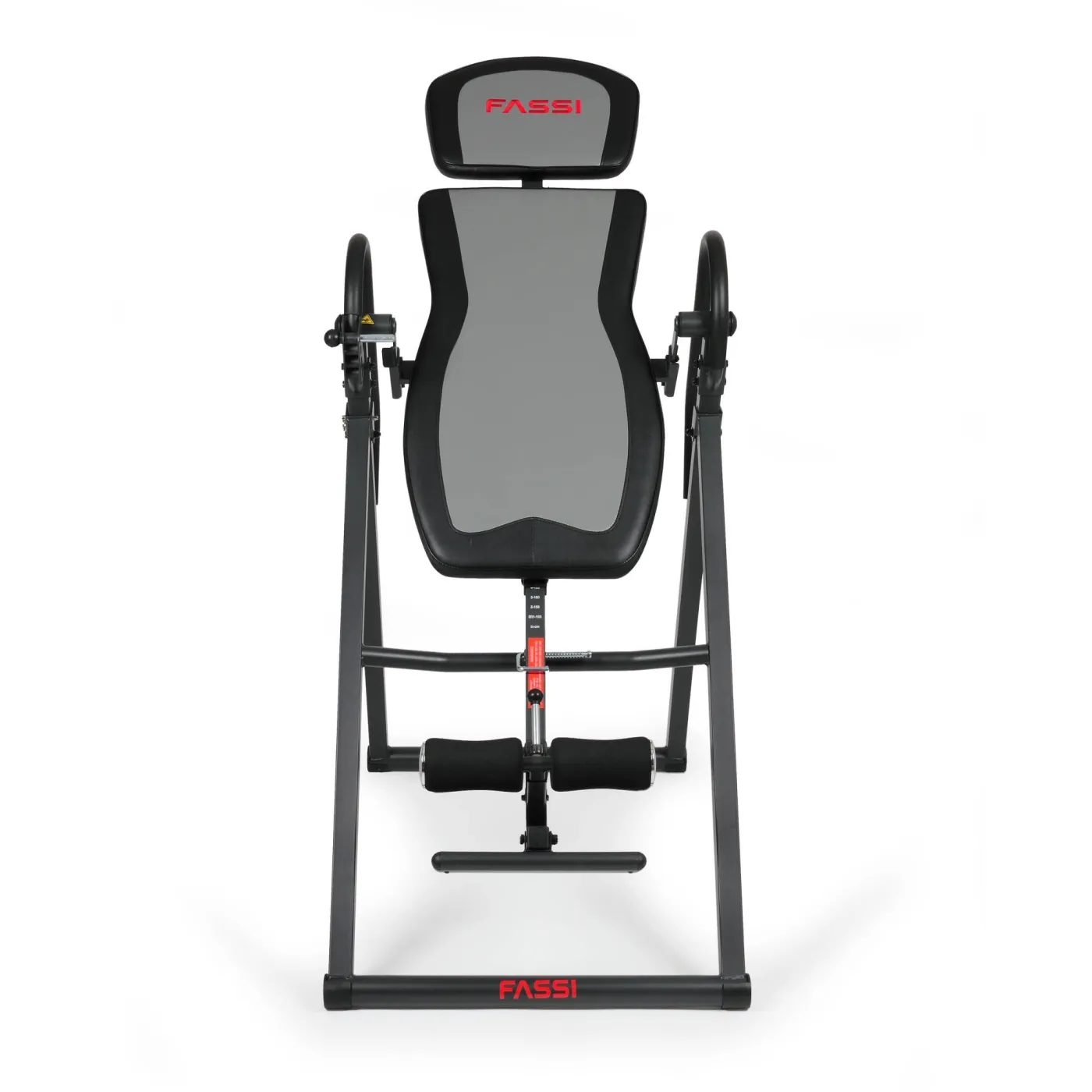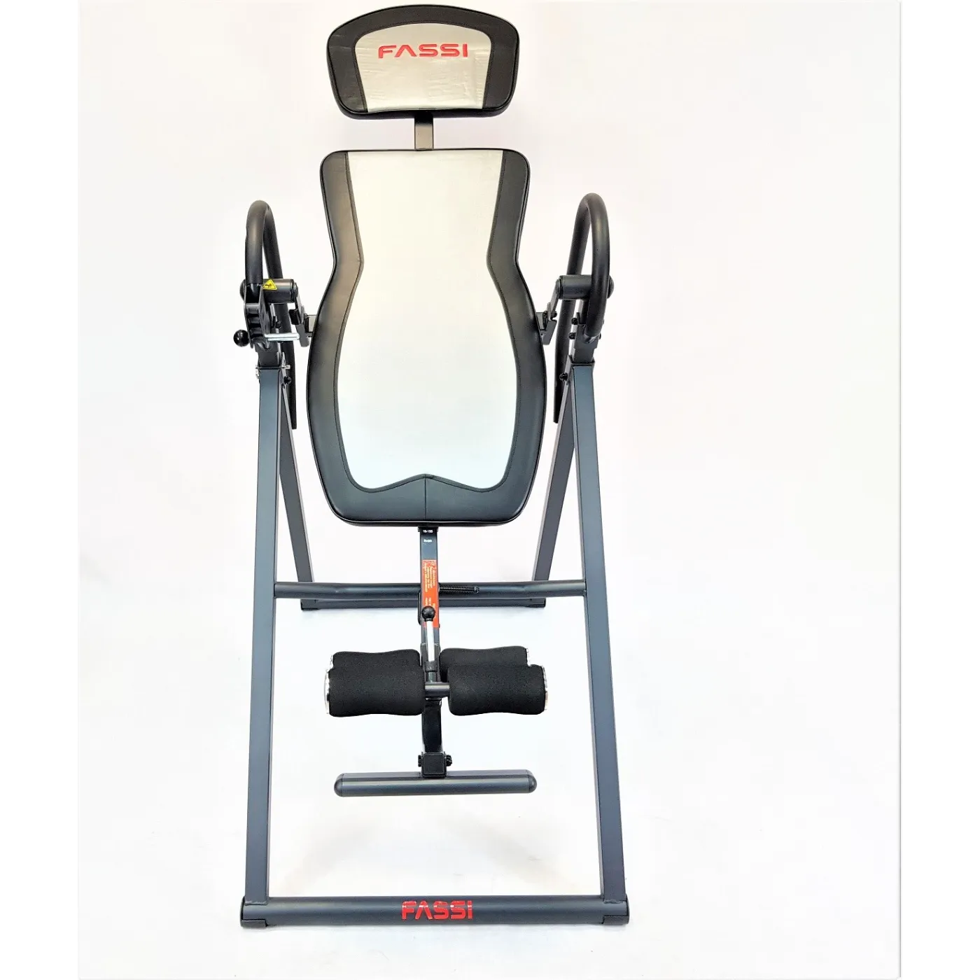 Składana ławka inwersyjna grawitacyjna FP-PW50, zaproponowana przez włoską firmę Fassi, oferuje sztywne oparcie wyposażone w obicie 35 mm, regulację obrotu w 4 różnych poziomach oraz rolki do blokowania kostek dźwignią zabezpieczającą.