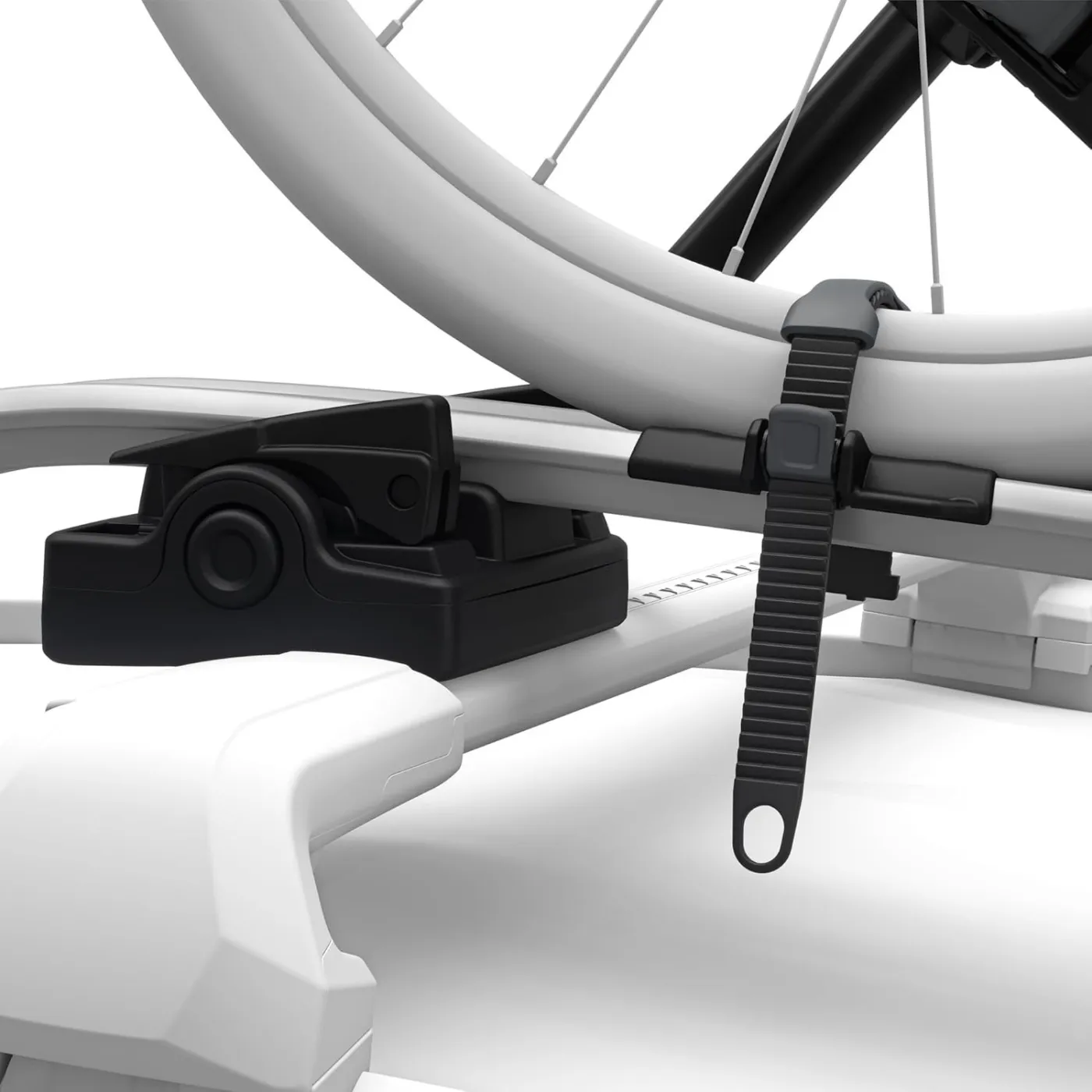 🛠️ Thule UpRide zapewnia stabilne mocowanie przedniego koła poprzez regulowane uchwyty, które precyzyjnie trzymają koło bez potrzeby dodatkowych adapterów. Tylne koło zabezpieczane jest szybkozamykaną taśmą, co gwarantuje szybki montaż i demontaż roweru bez użycia narzędzi. To sprawia, że cała procedura zajmuje dosłownie kilka chwil, a podróż może rozpocząć się natychmiast.