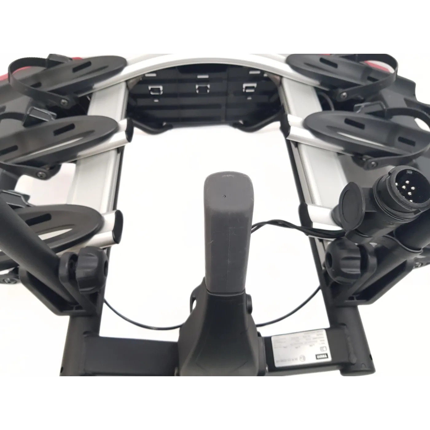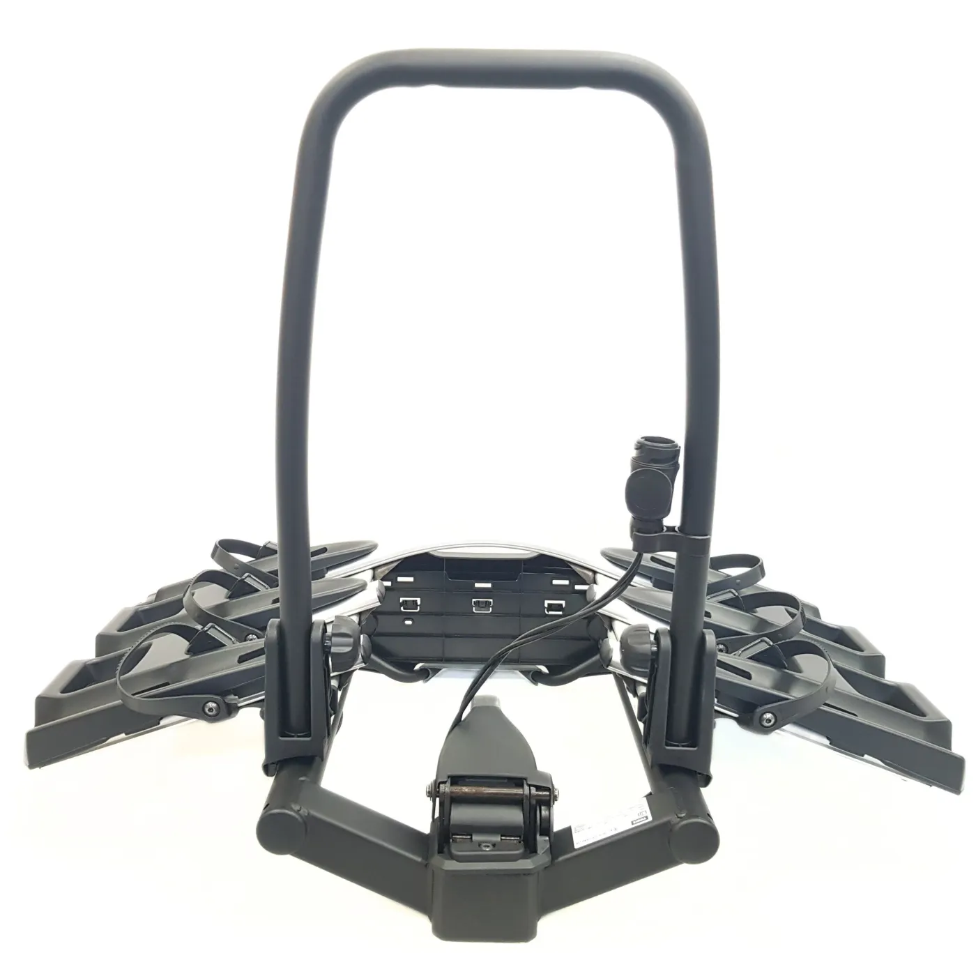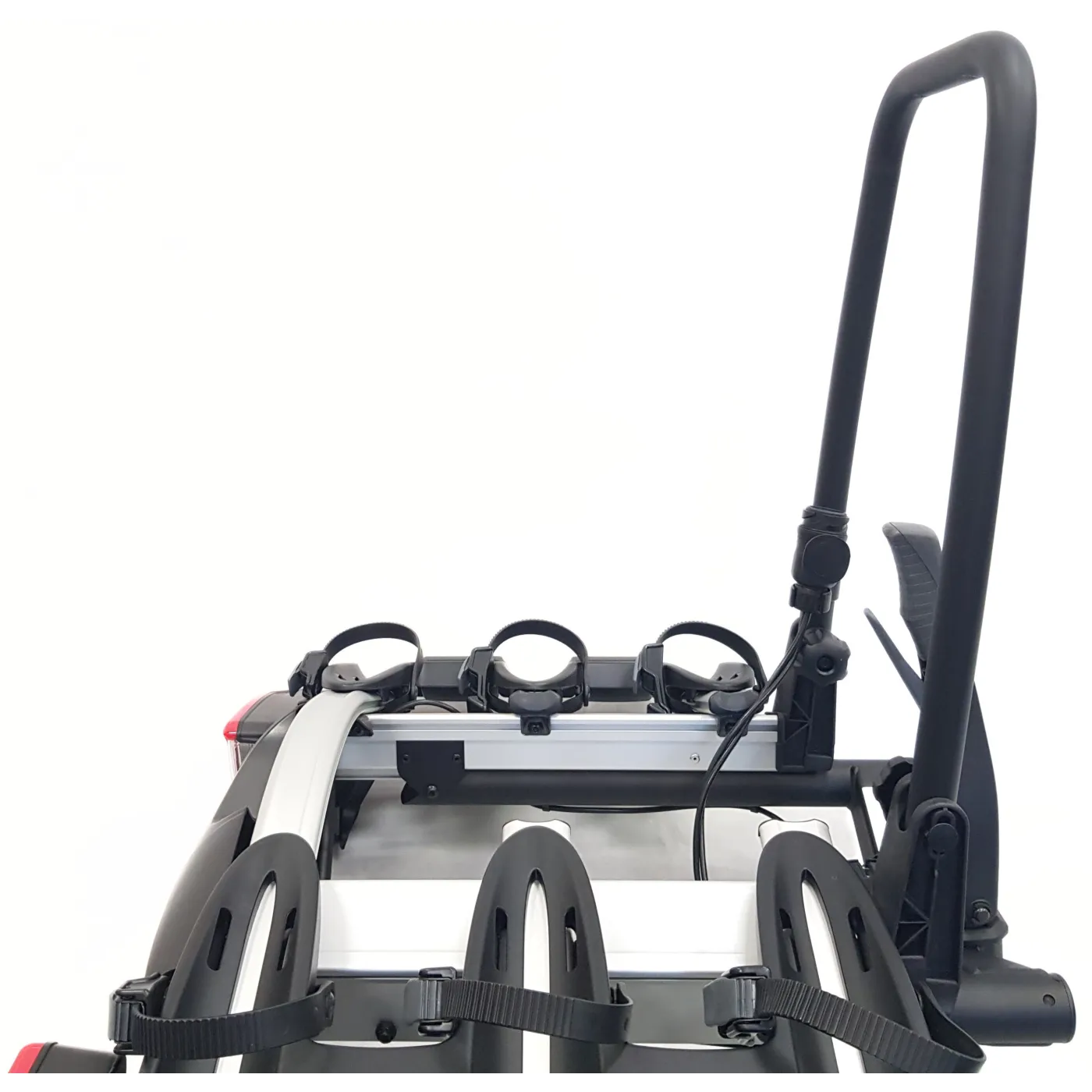 💡 Praktycznym atutem tego modelu jest możliwość łatwego odchylania całej konstrukcji – nawet z zamontowanymi rowerami – co zapewnia bezproblemowy dostęp do bagażnika auta. Po zakończeniu użytkowania bagażnik składa się do kompaktowych rozmiarów 103 x 72 x 36 cm i bez problemu mieści się w większości bagażników samochodowych.