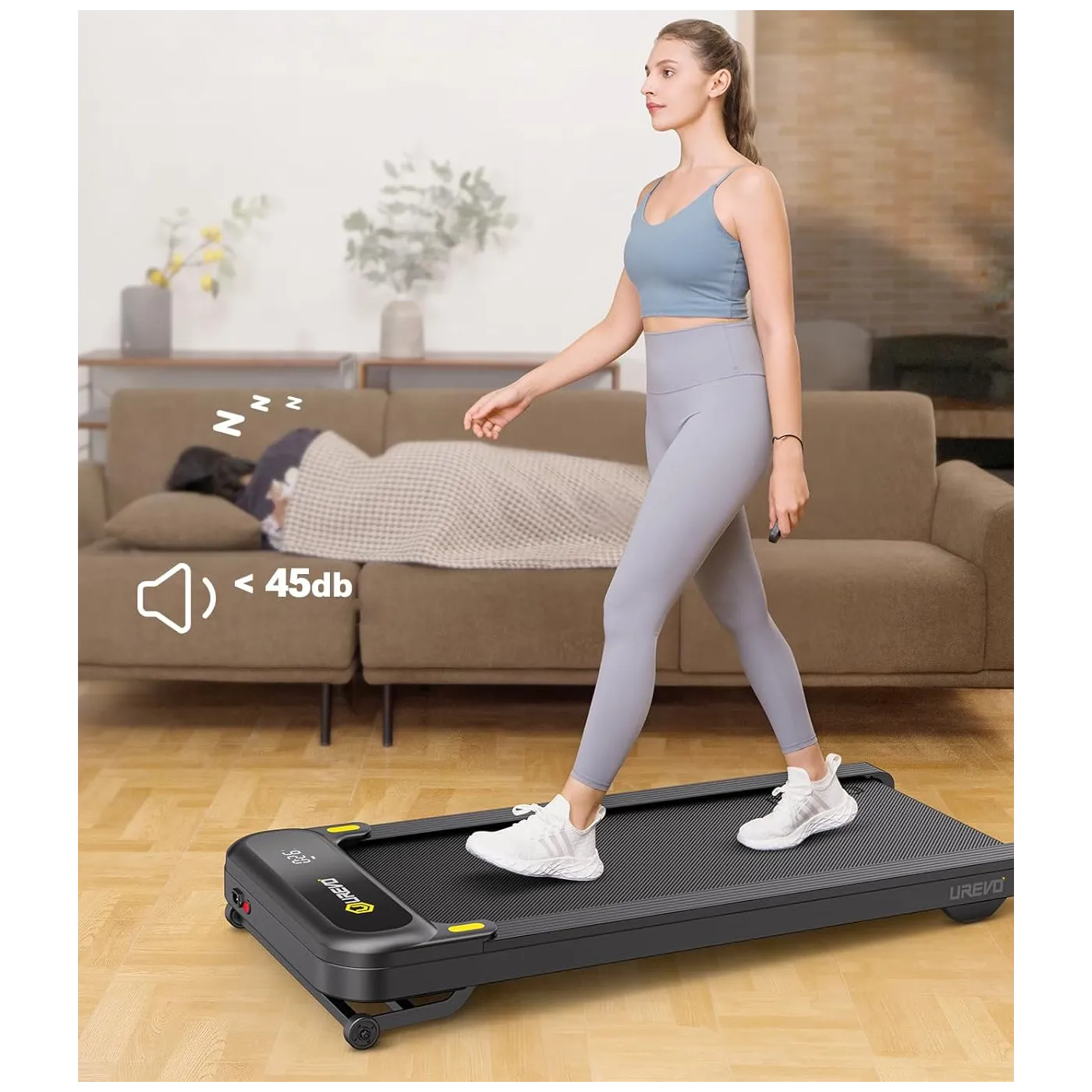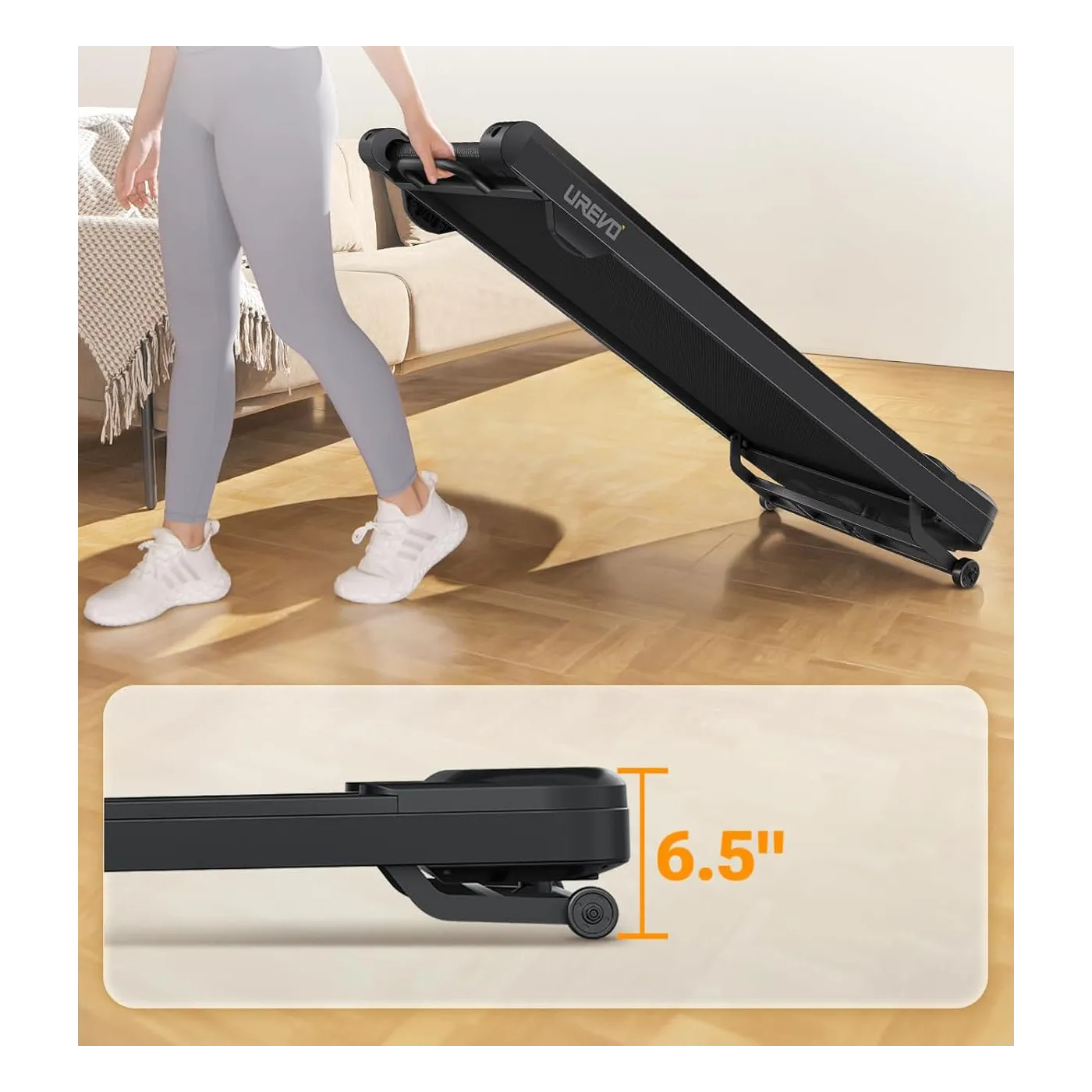 Bieżnia została zaprojektowana z myślą o małych przestrzeniach. Jej wysokość to zaledwie 6,5 cala, dzięki czemu z łatwością wsuniesz ją pod łóżko, sofę lub kanapę.
