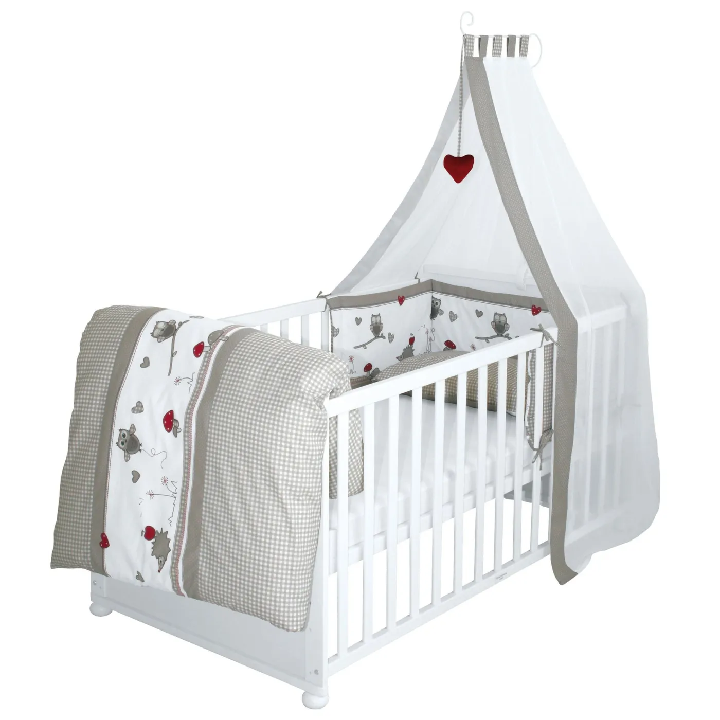 😻 Zestaw obejmuje komplet pościelowy z certyfikatem TÜV, rozkładane łóżeczko dziecięce, miękko wyściełane gniazdko, materac antyalergiczny (70 x 140 cm), a także baldachim.
