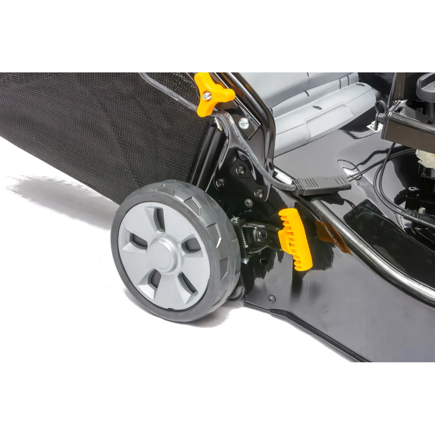 ▶ SYSTEM KOSZENIA: Szerokość cięcia 46 cm; 3-dźwigniowa regulacja wysokości (6 poziomów, 22–80 mm)