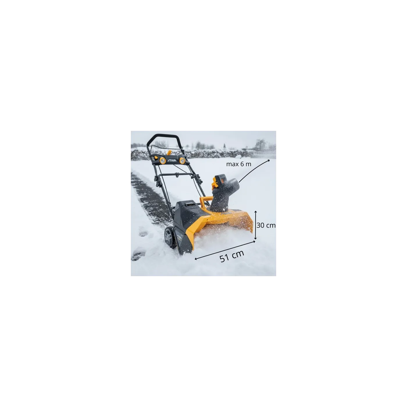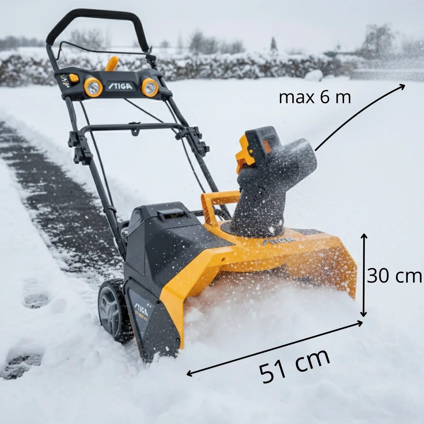 Odśnieżarka STIGA ST 4851 AE oferuje szerokość roboczą 51 cm, co pozwala sprawnie usuwać śnieg z podjazdów, chodników i innych twardych nawierzchni. Jej maksymalna wysokość pokrywy śnieżnej wynosi 30 cm, dzięki czemu radzi sobie z typowymi zimowymi opadami. Rozluźniony śnieg może być wyrzucany na odległość do 6 metrów, a kierunek odprowadzania można dowolnie ustawić dzięki wyrzutnikowi obracanemu o 180°. Konstrukcja ta zapewnia wygodną i skuteczną pracę w codziennych warunkach zimowych.