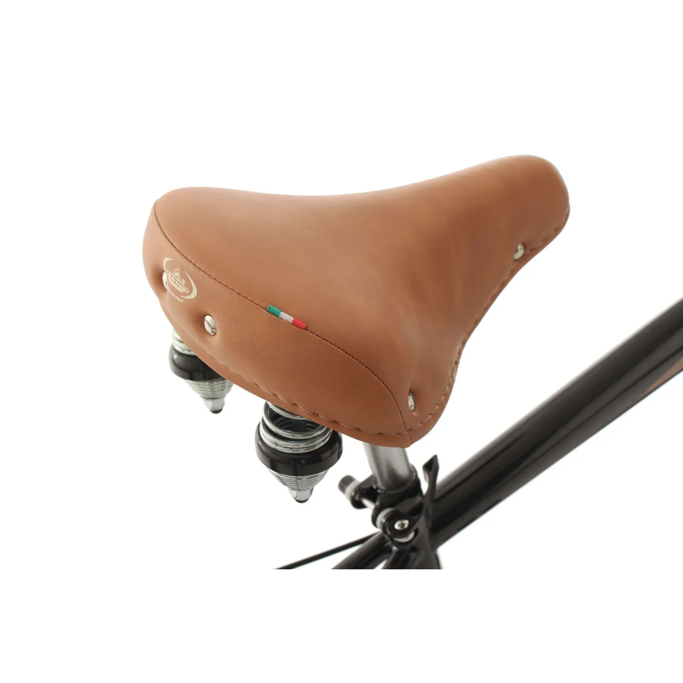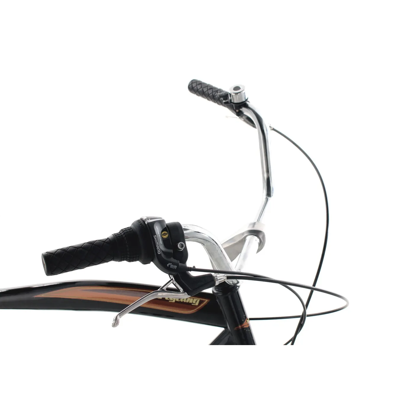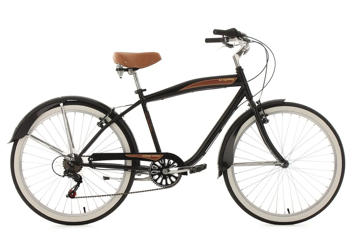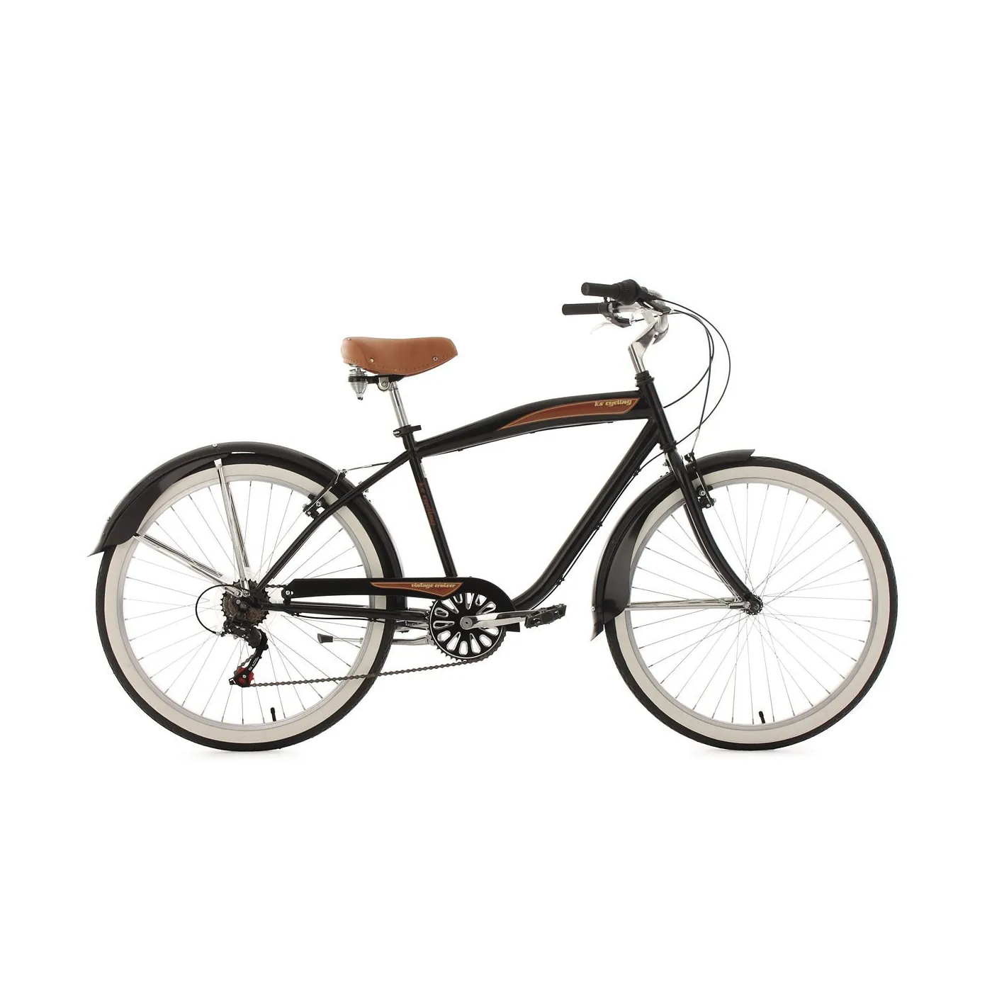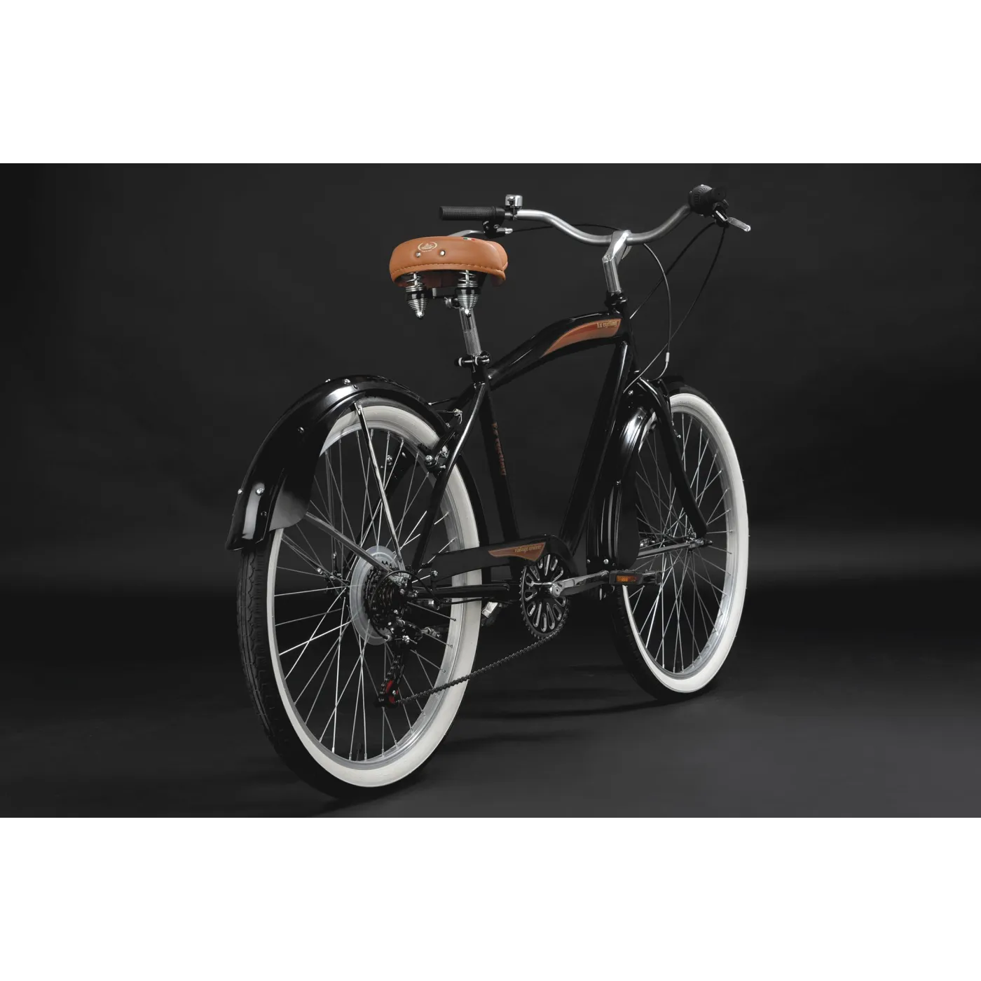 Podstawą jest stylowa czarna rama z bardzo szeroką górną rurą oraz brązowe dodatki w stylu retro. Wyposażony w 6-biegową przerzutkę SHIMANO, intuicyjną obrotową manetkę i sprężynowe siodełko daje czysty komfort jazdy. Świetnie nadaje się w szczególności do jazdy po mieście, gdyż jest nie tylko stylowy, ale także niezwykle wygodny. Falista rama, szeroka kierownica i wyjątkowe detale wyróżniają go wśród pozostałych miejskich jednośladów. Jego prostota i niepowtarzalny design sprawią, że pokochasz go od pierwszego wejrzenia.