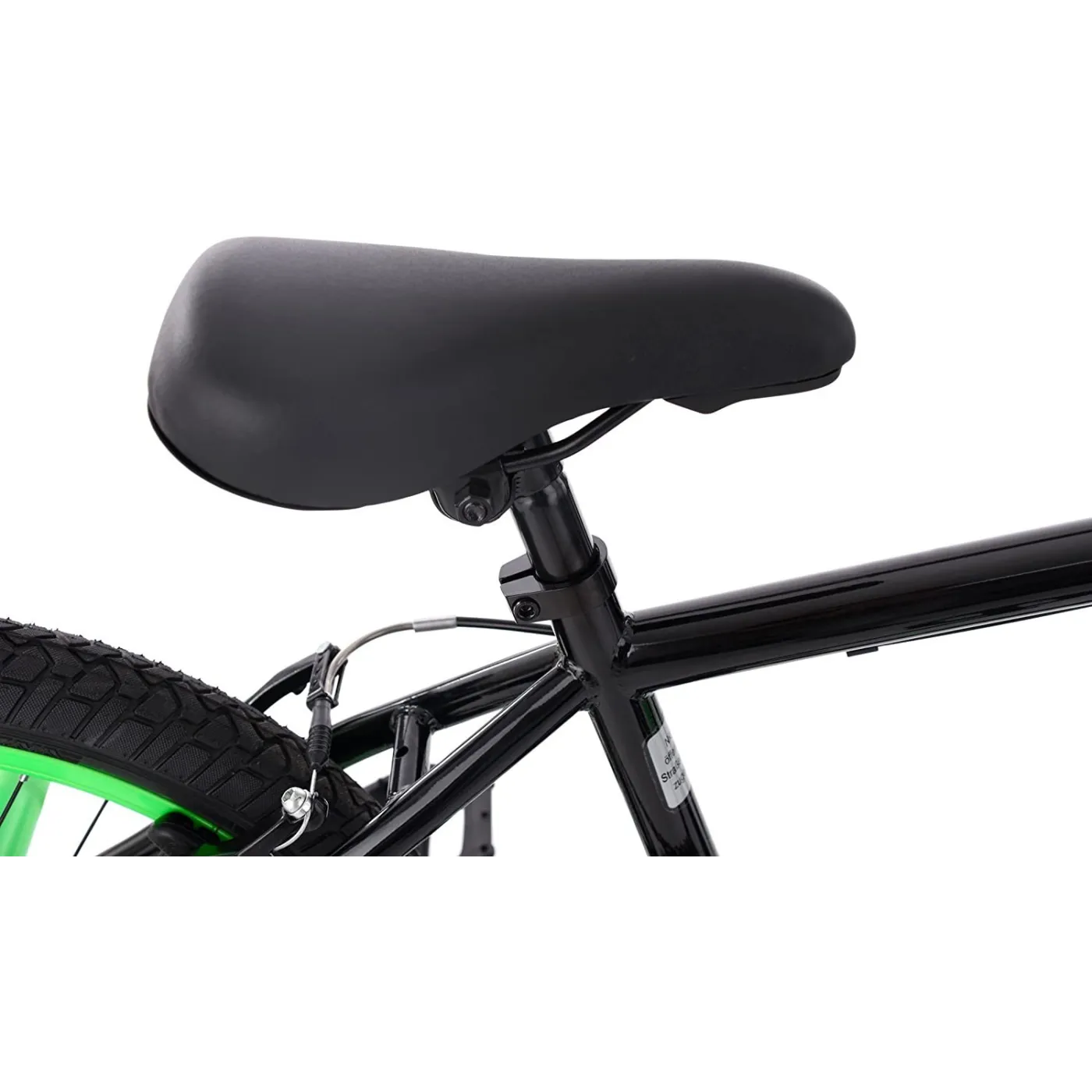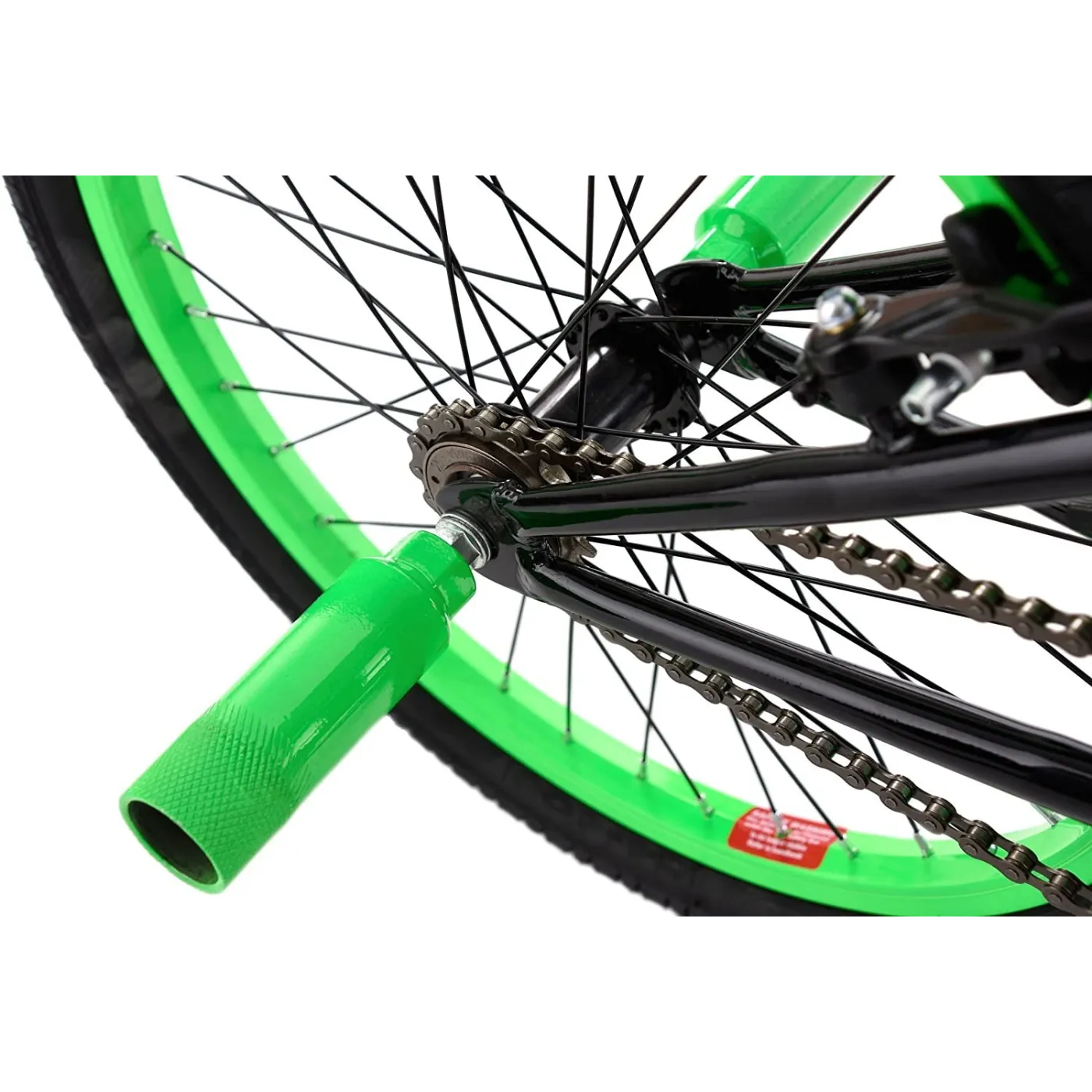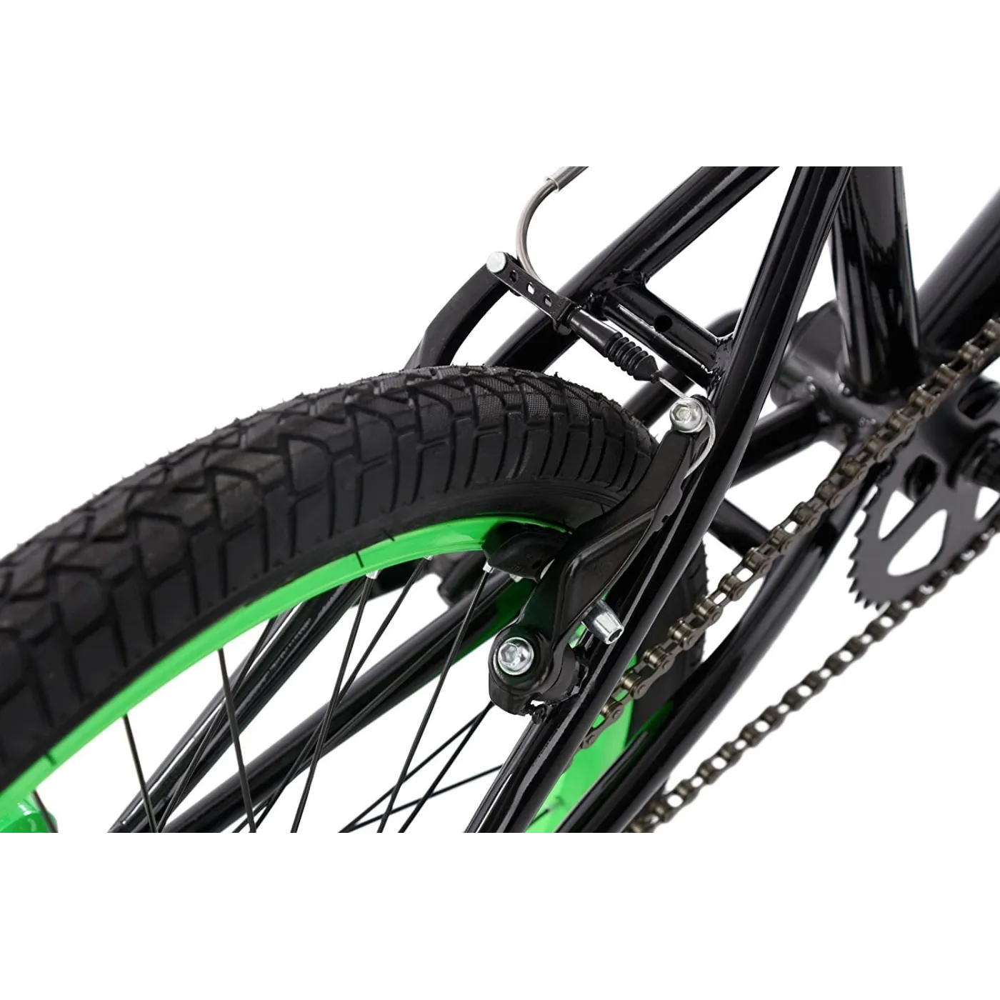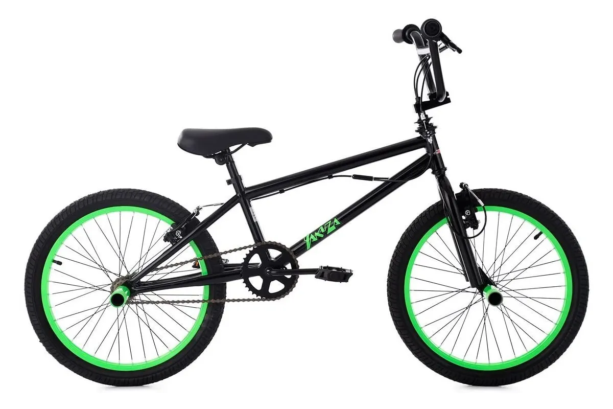 Stylowy wygląd: zielone akcenty świetnie współgrają z czarną ramą, której wielkość nie przekracza 25 cm. Ponadto rower posiada obrotową, regulowaną kierownicę, 20-calowe opony, hamulce V-Brake oraz dodatkowe pegi. Budowa roweru jest uproszczona, przy czym bardzo wytrzymała, aby bezpiecznie wykonywać skoki i inne akrobacje.