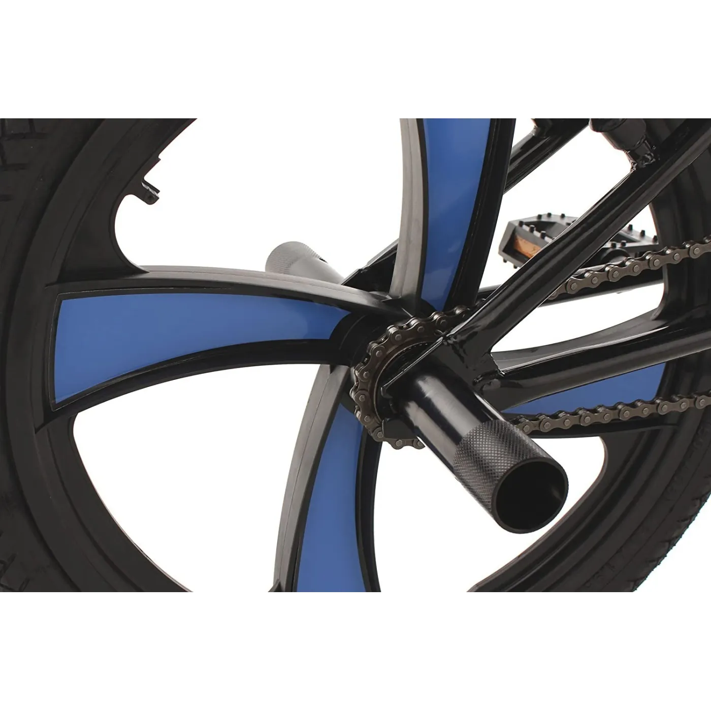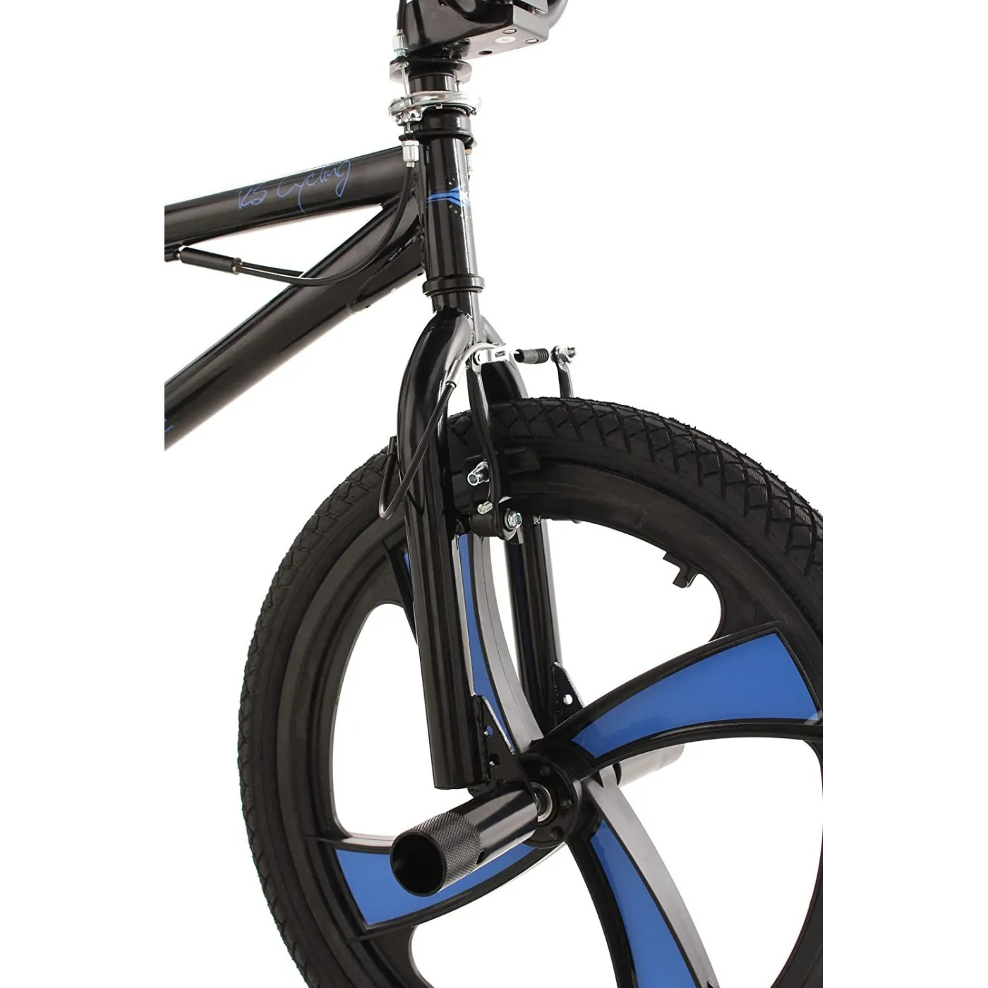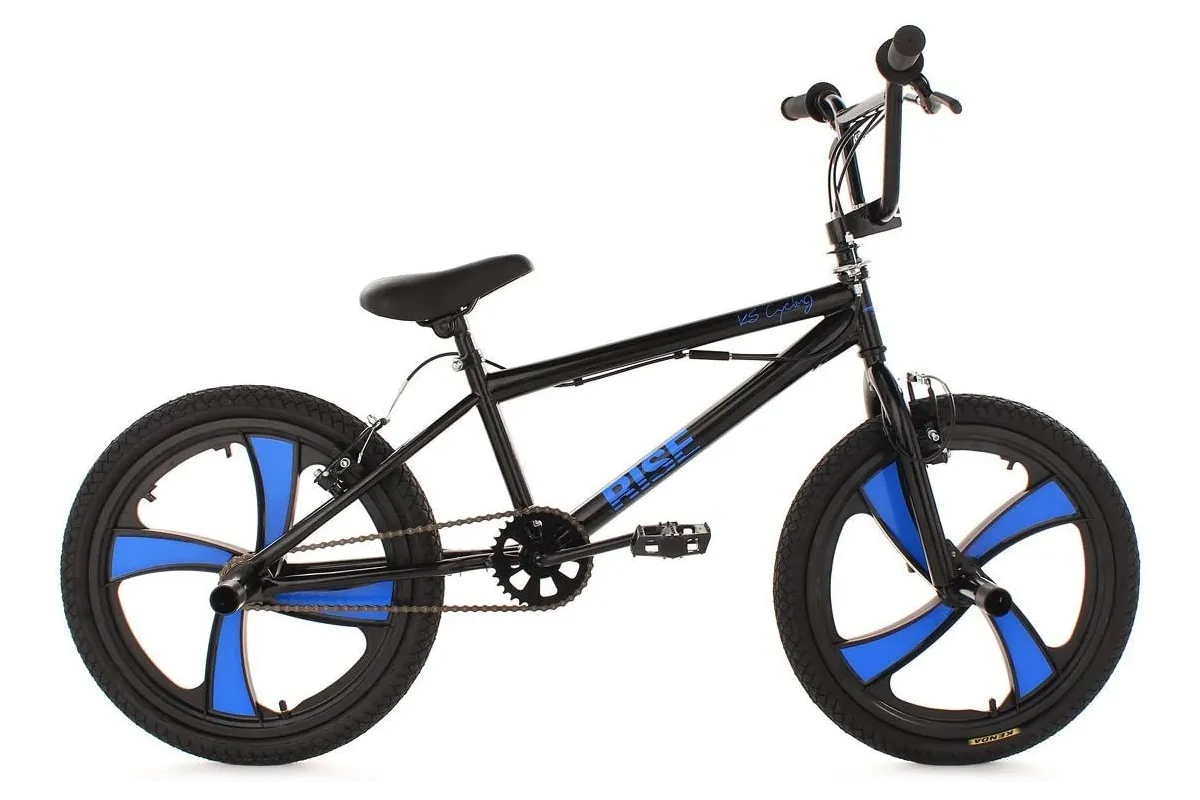 BMX Rise to bardzo unikalny model. Uwagę przyciągają oryginalne koła, które wyglądają bardzo efektownie w czasie jazdy. BMX posiada dwuczęściową kierownicę obracającą się o 360 stopni, wyregulujesz także jej wysokość i pochył. Stalowa konstrukcja sprawia, że możesz czuć się pewnie i bezpiecznie na swoim rowerze. Prezentowany model dostępny jest w czarnym kolorze, z bardzo wyrazistymi niebieskimi elementami.