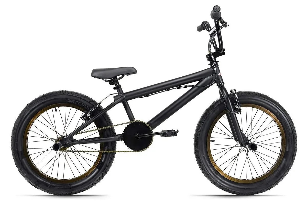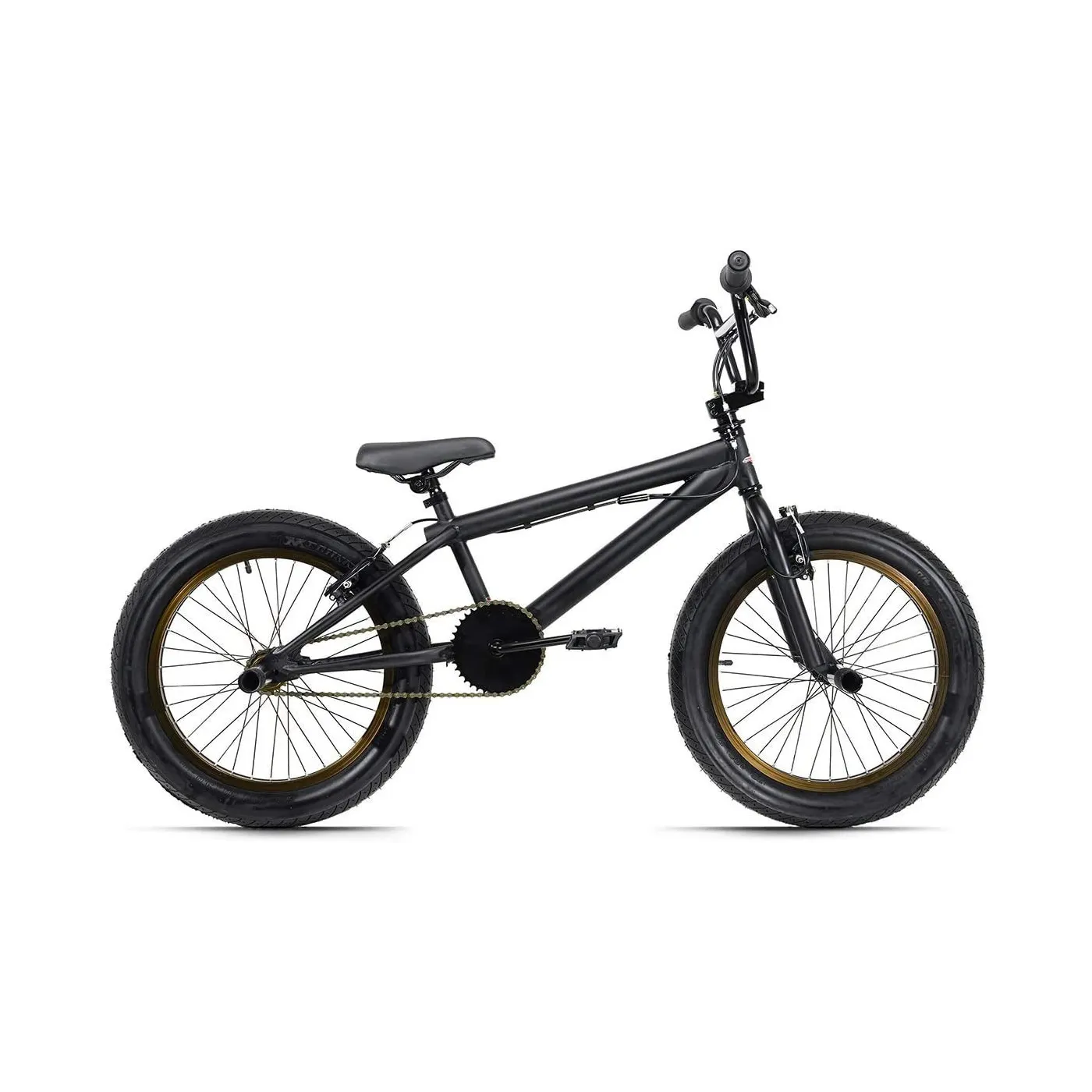 20-calowy BMX FATT firmy KS Cycling zaprojektowany w całości w kolorze czarnym, z matową ramą w połączeniu z brązowymi, połyskującymi obręczami. Nie mogło być lepiej! Do tego cztery stalowe pegi do trików i najważniejsze - szerokie opony FATT. To one sprawiają, że rower przyciąga wzrok i zdecydowanie wyróżnia się spośród reszty. Wyjątkowy rower zachwyca solidnością i wykonaniem.