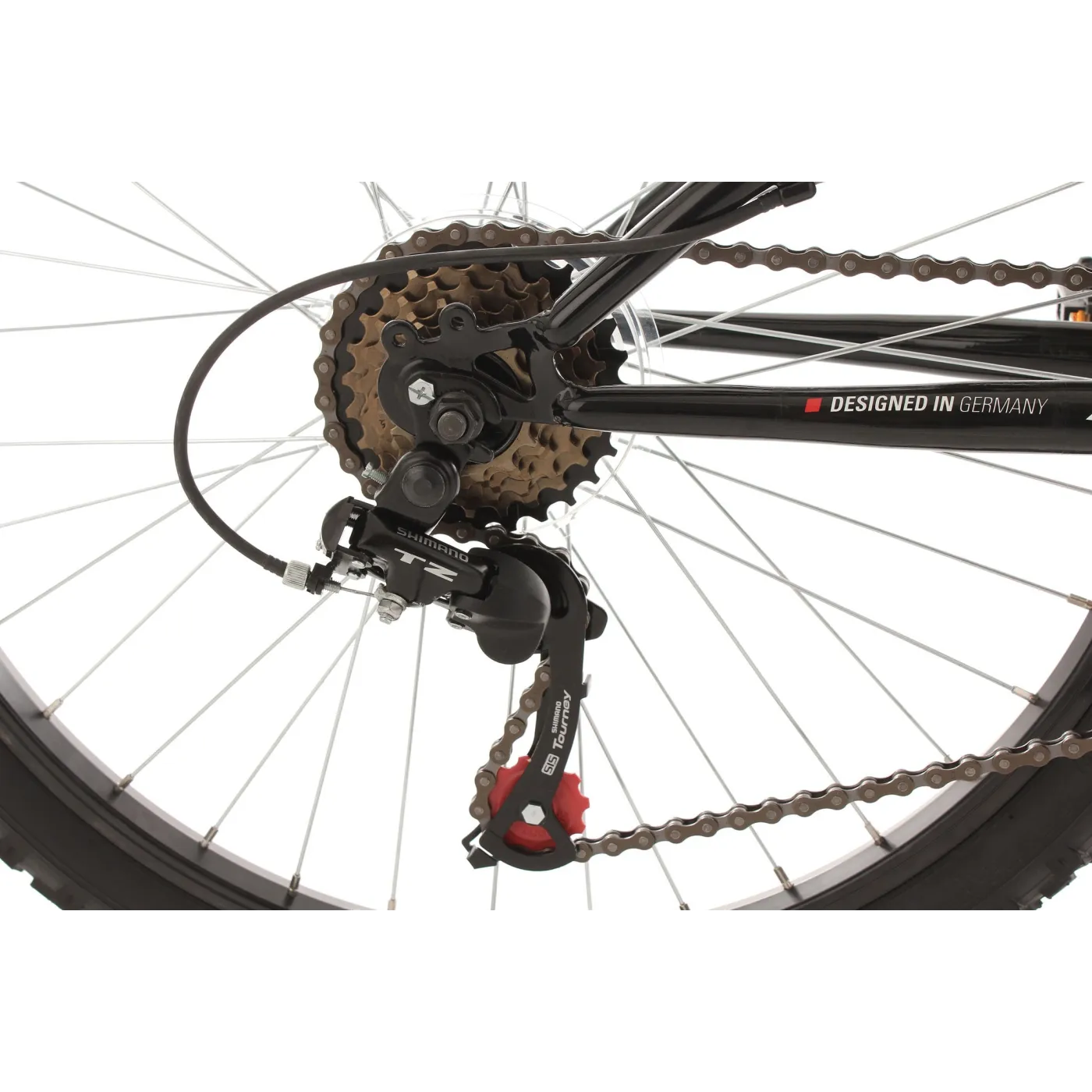 Stalowa amortyzowana rama, 6 biegów Shimano oraz niezawodne hamulce zadbają o komfort i bezpieczeństwo podczas każdej wycieczki.
