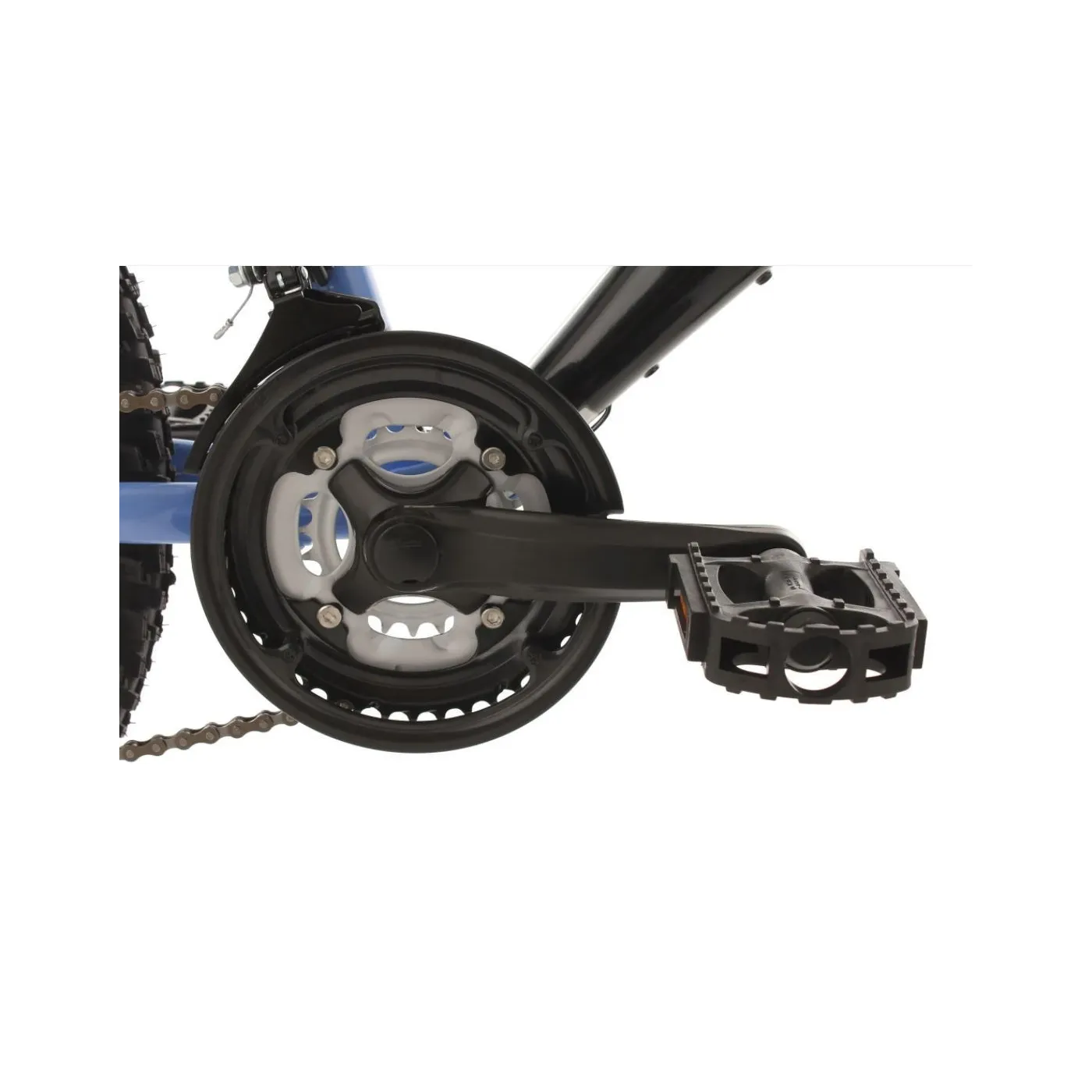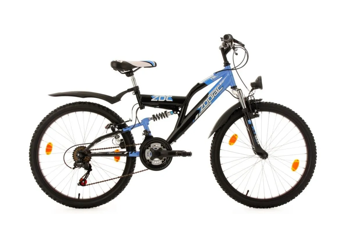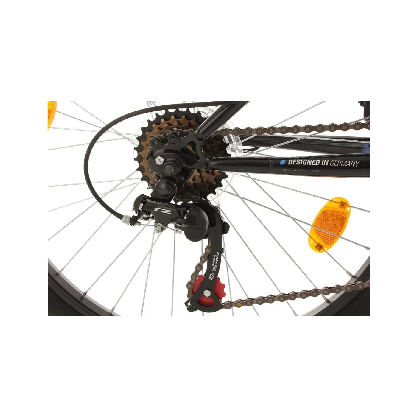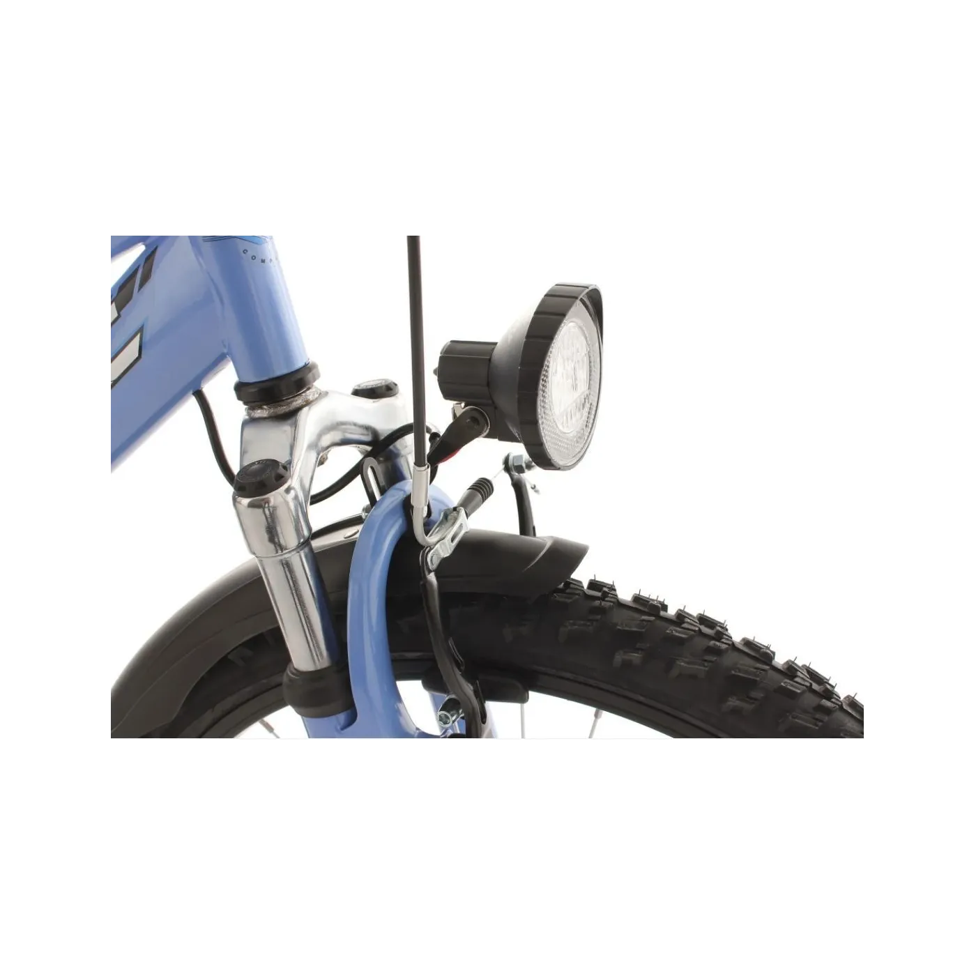 Podstawę tworzą widelec amortyzowany i rama resorowana. Masywne opony i design w kolorze niebieskim i czarnym sprawiają, że rower dziecięcy przyciąga wzrok. Hamulce typu V z przodu i z tyłu oraz oczywiście oświetlenie napędzane dynamem zapewniają bezpieczeństwo. Rower jest również wyposażony w 18-biegową przerzutkę SHIMANO.
