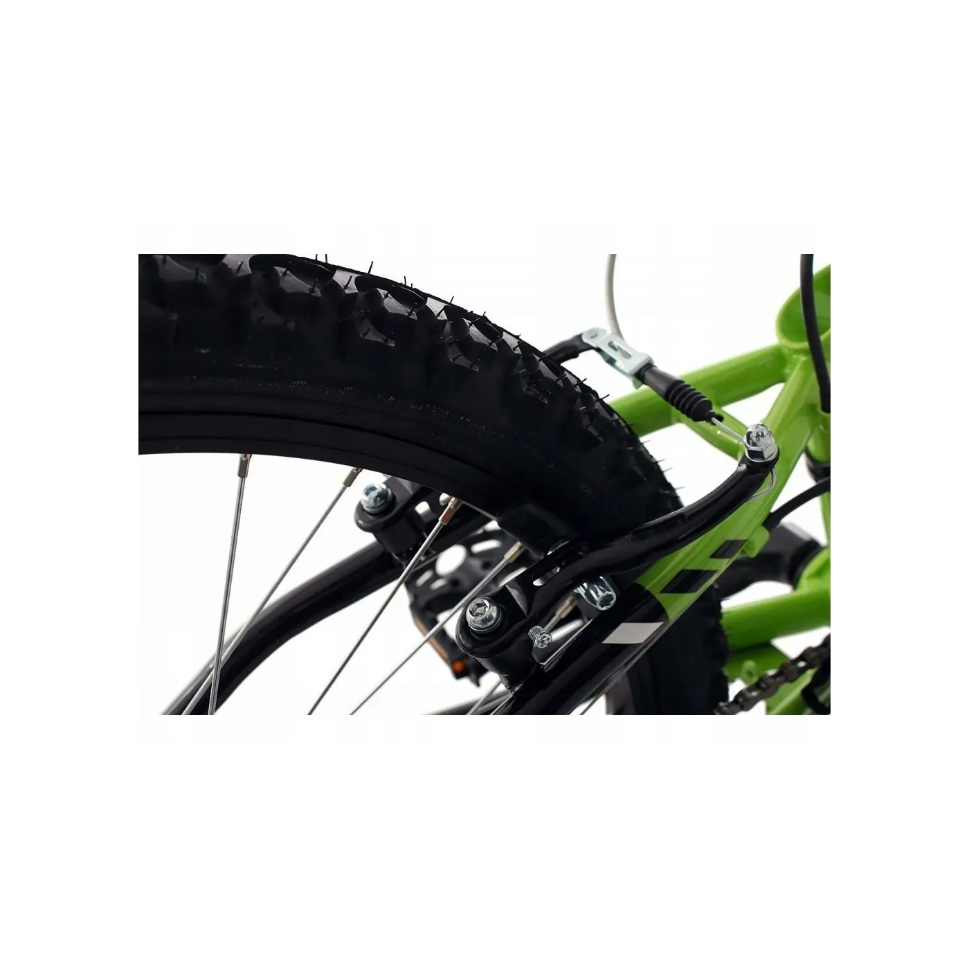 Łączy w sobie oryginalną kolorystykę z funkcjonalnością. Zielono-czarno-biały kolor na pewno przypadnie do gustu każdemu dziecku a dzięki amortyzacji ramy i widelca zachowuje doskonałe właściwości jezdne. 18 przerzutek Shimano oraz manetki obrotowe zadowolą każdego, małego rowerzystę. To świetny rower o sportowym charakterze i świetny partner do codziennych zabaw.