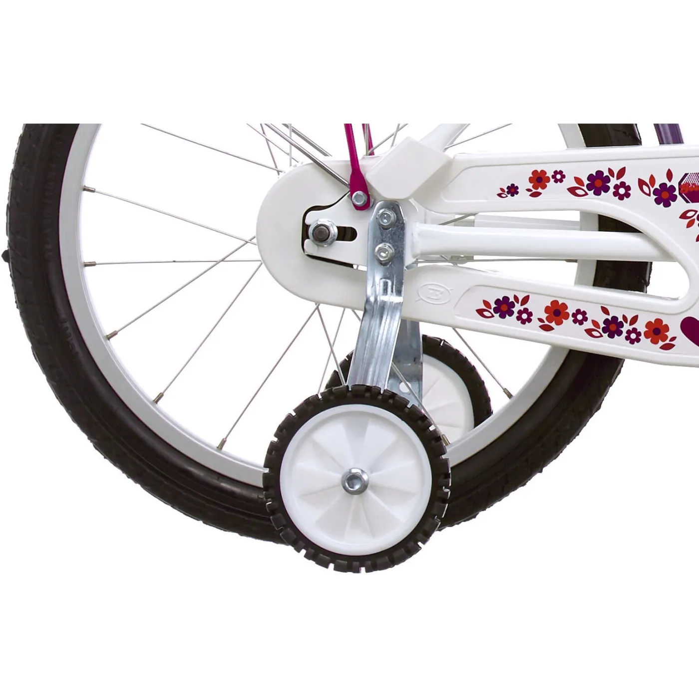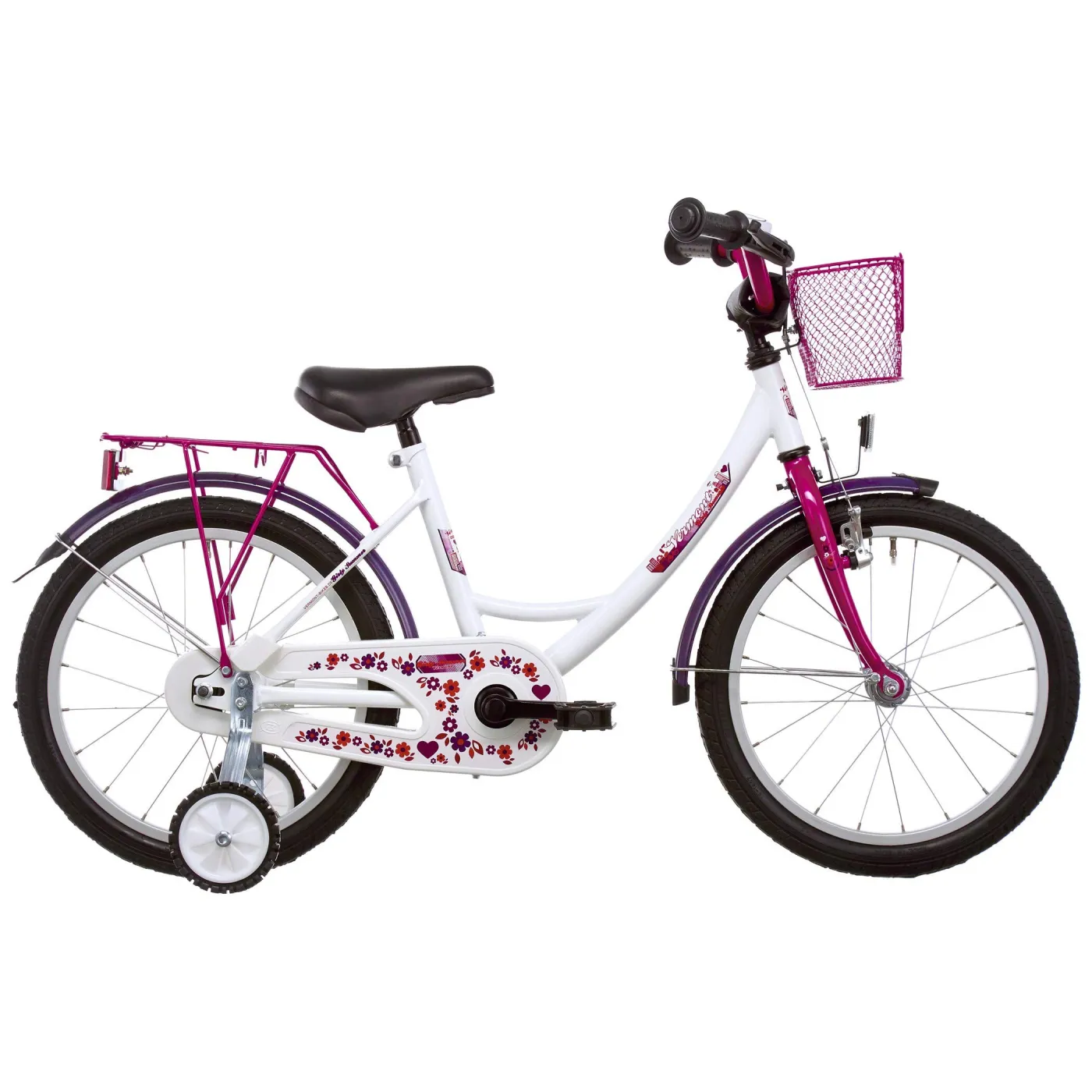 Posiada wytrzymałą ramę, która dzięki swojej konstrukcji umożliwia bezproblemowe wsiadanie i zsiadanie, gumowe pedały bez ostrych krawędzi z odblaskami, osłonę łańcucha, ochronkę na kierownicy, hamulec szczękowy oraz torpedo (kontrę). Dodatkowo wyposażony jest w dzwonek, błotniki oraz odblaski, a także praktyczny kosz na kierownicy i bagażnik. Całość wykończona jest w kolorach różu, bieli i fioletu, dodając mu uroku.