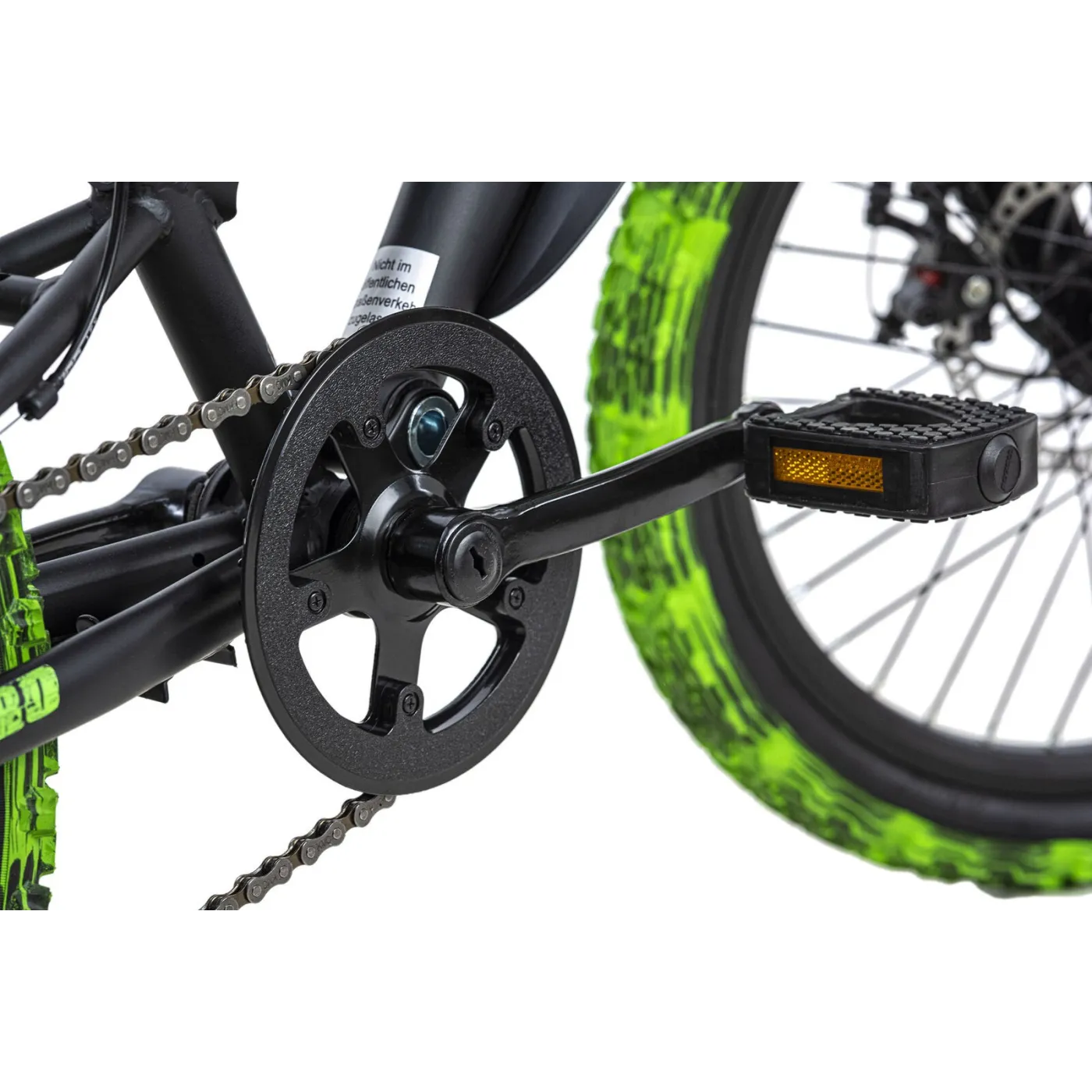 BLISS firmy KS Cycling to wytrzymały rower górski dla najmłodszych, który w niczym nie ustępuje wyglądowi dorosłych. Każda z opon z grubym bieżnikiem jest wyjątkowa, a zielono czarny wzór z specjalnymi efektami sprawia, że rower przyciąga wzrok. Mechaniczne hamulce tarczowe z przodu i z tyłu zapewniają bezpieczeństwo. Rower jest również wyposażony w 7-biegową przerzutkę firmy Shimano.