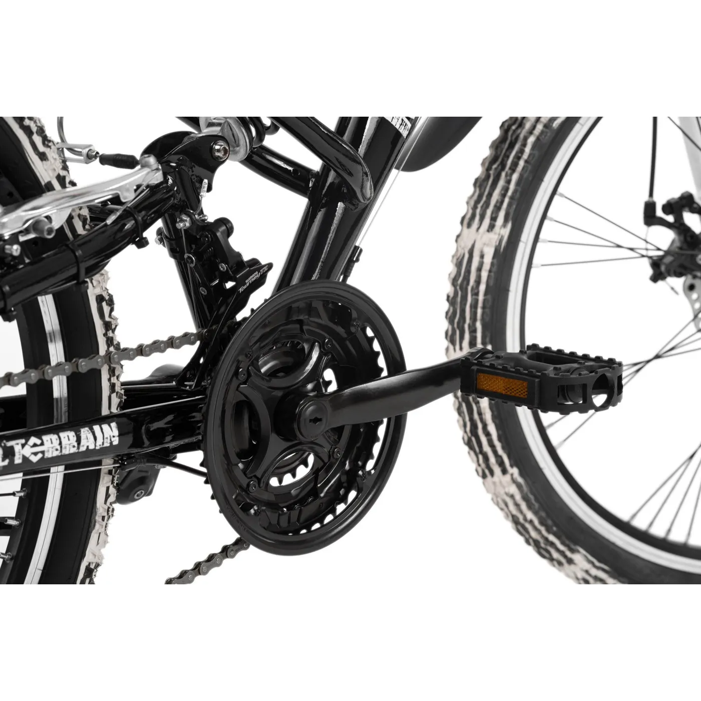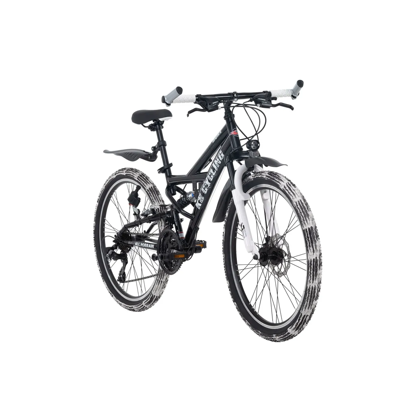 Idealny w drodze do szkoły lub na weekendowy wypad. 24-calowy młodzieżowy rower górski CRUSHER firmy KS Cycling jest idealny do rozpoczęcia kolarstwa górskiego. Czarna rama z białymi detalami jest stylizowana, dopasowana do opon i przyciąga uwagę wszystkich. Każda opona jest wyjątkowa, a wyposażenie techniczne roweru dziecięcego nie pozostawia nic do życzenia. Rower górski z pełnym zawieszeniem jest wyposażony w hamulce tarczowe, a 21-biegowe przełożenia z obrotowymi manetkami uzupełniają pakiet.