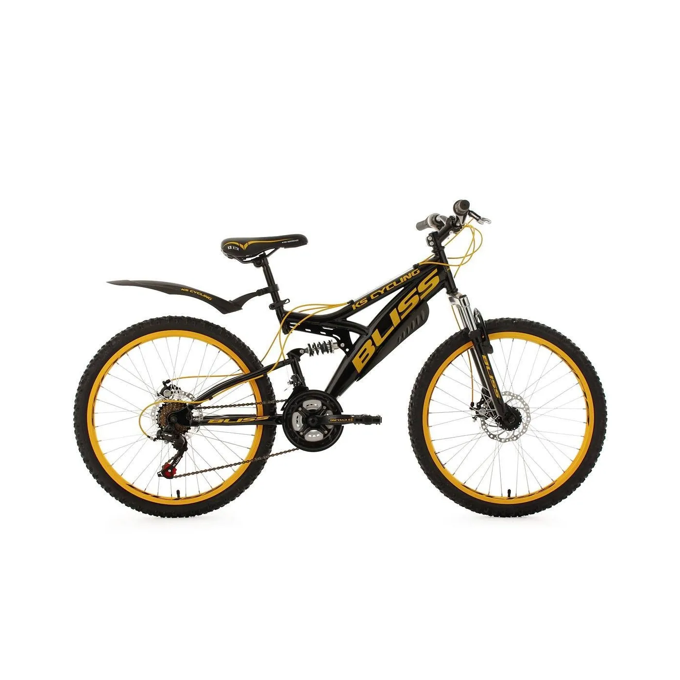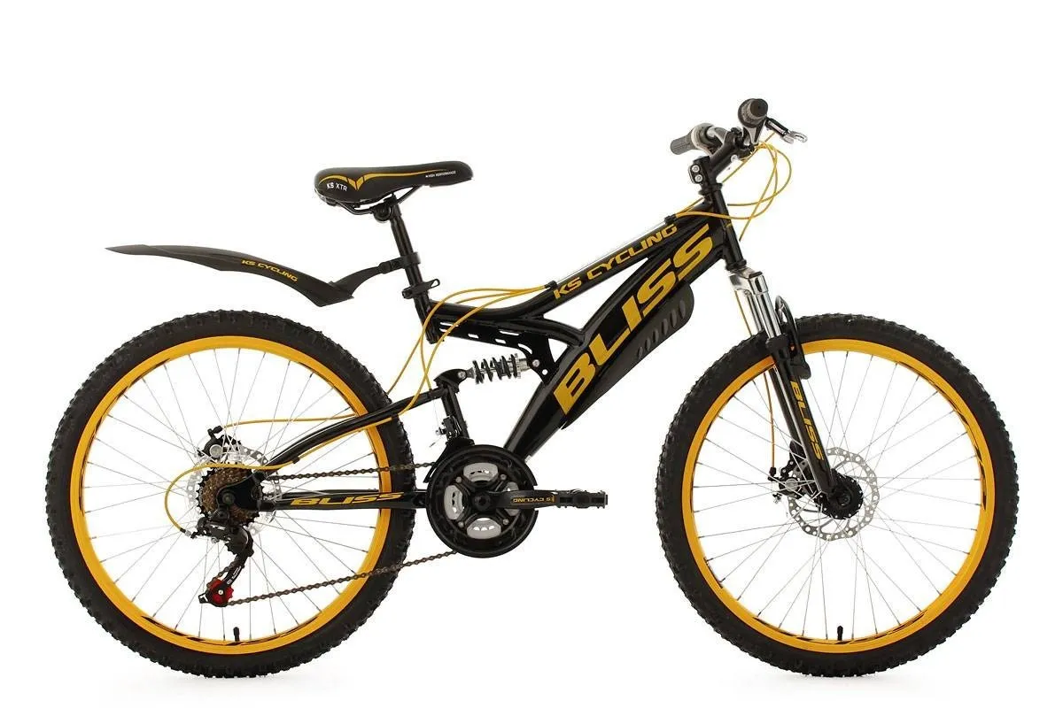 24-calowy rower górski z pełnym zawieszeniem w klasycznym kolorze ramy połączonym z kontrastowymi detalami w kolorze pomarańczowym.
