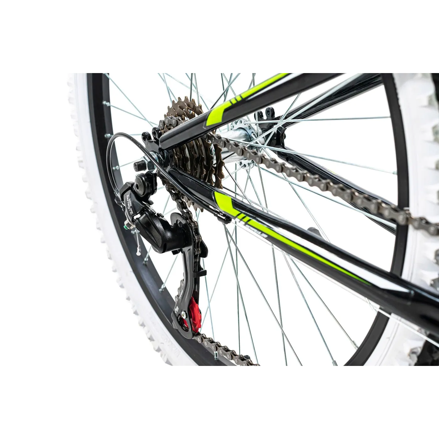 Grube opony i czarny design sprawiają, że rower przyciąga wzrok. Hamulce V-brake z przodu oraz z tyłu zapewniają bezpieczeństwo, a 6-biegowa przerzutka Shimano Tourney oferuje odpowiedni zakres regulacji.