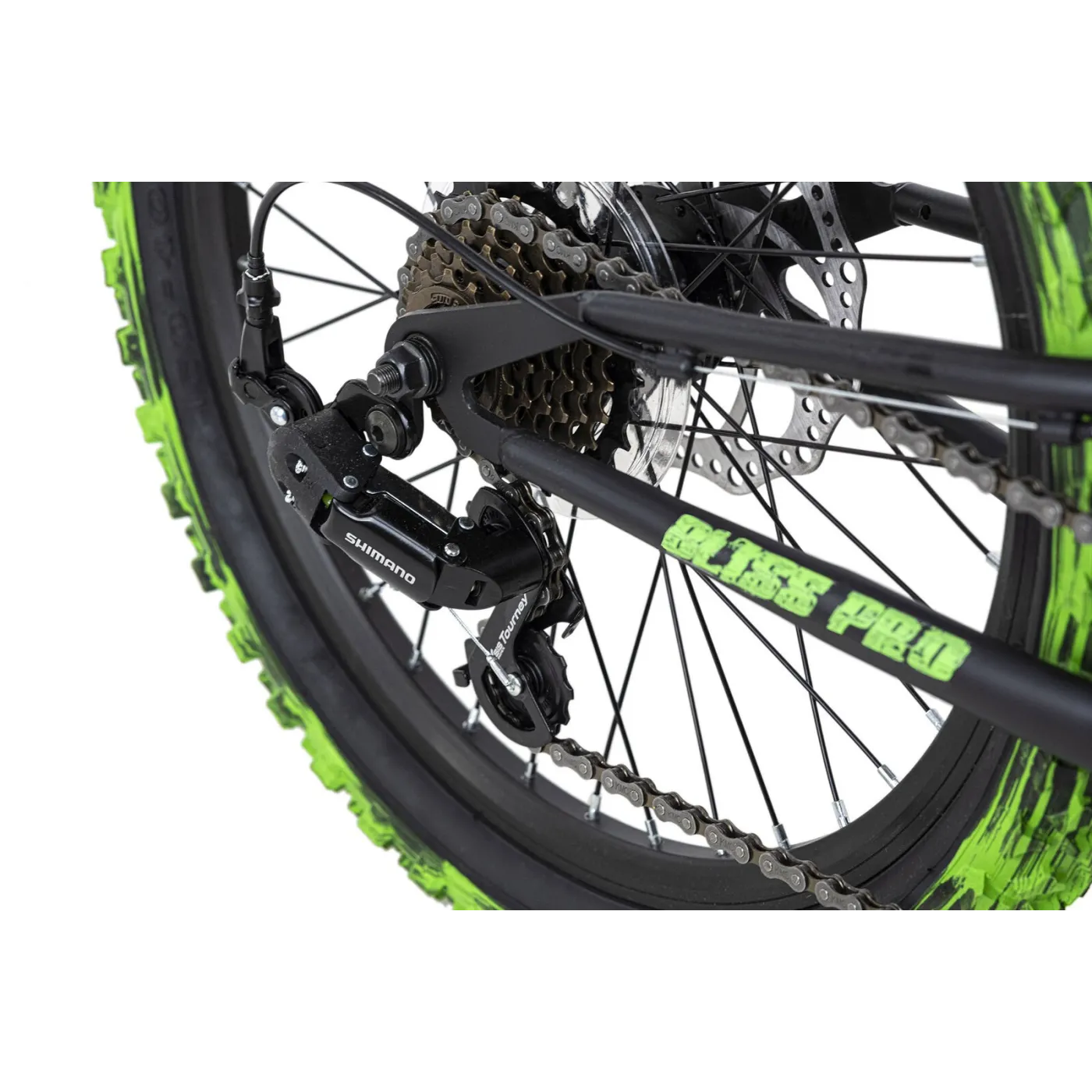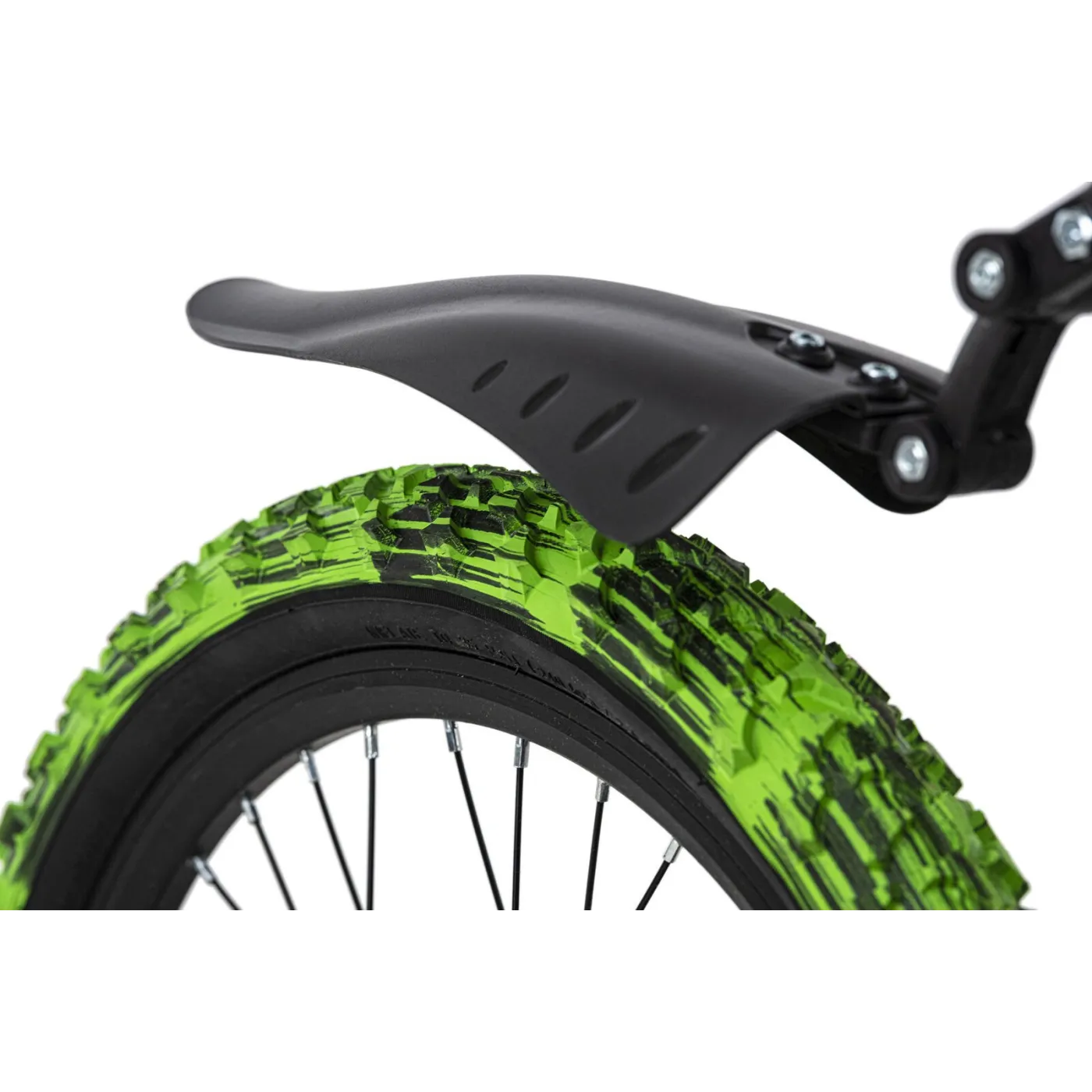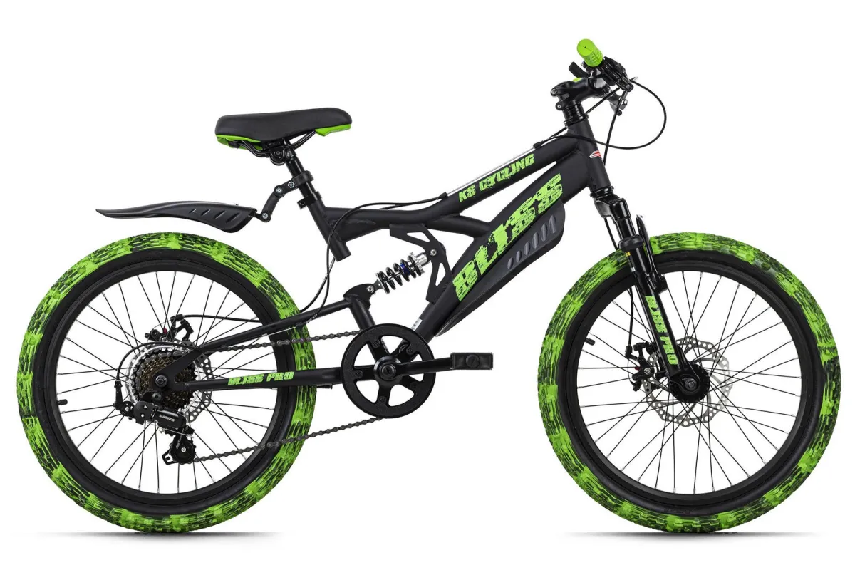 BLISS firmy KS Cycling to wytrzymały rower górski dla najmłodszych, który w niczym nie ustępuje wyglądowi dorosłych. Każda z opon z grubym bieżnikiem jest wyjątkowa, a zielono czarny wzór z specjalnymi efektami sprawia, że rower przyciąga wzrok. Mechaniczne hamulce tarczowe z przodu i z tyłu zapewniają bezpieczeństwo. Rower jest również wyposażony w 7-biegową przerzutkę firmy Shimano.
