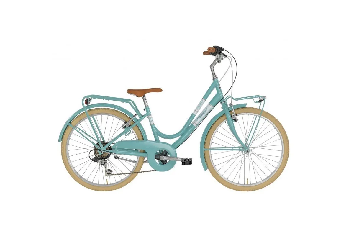 Niebieski rower miejski Milly z kremowymi oponami i brązowymi dodatkami tworzy uroczą całość i zachwyci niejedną młodą damę.