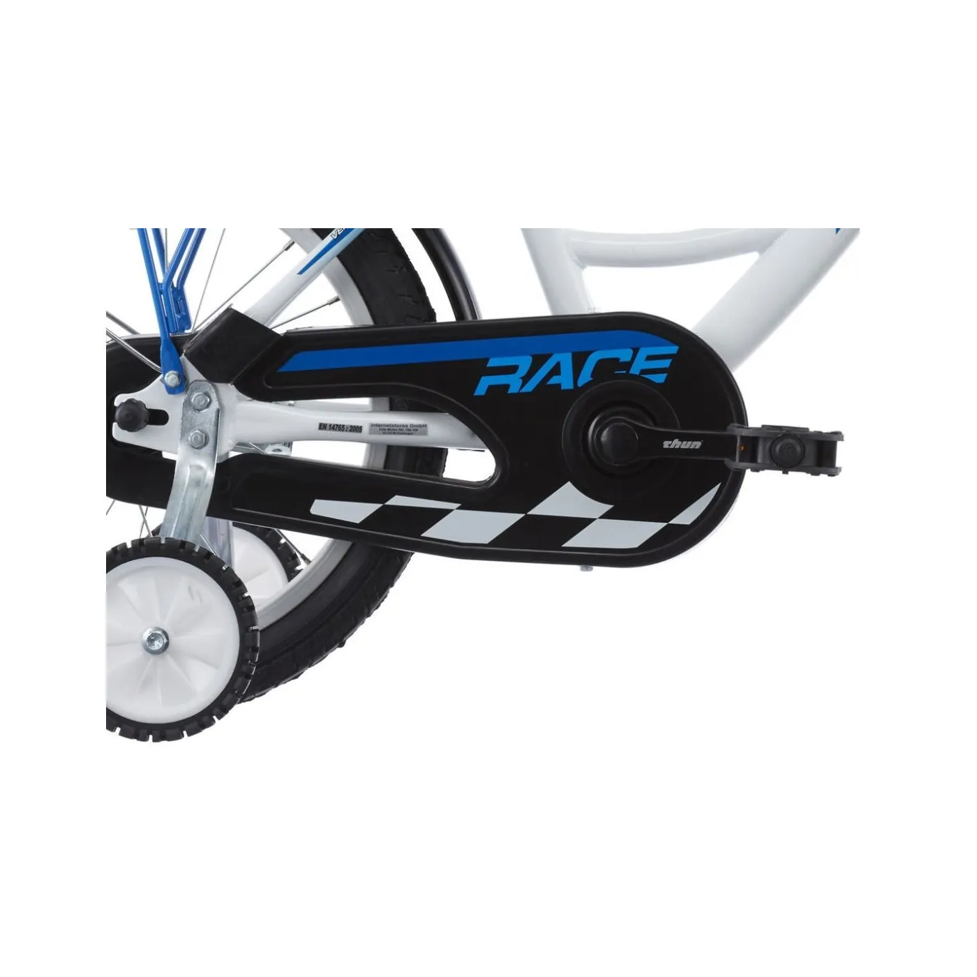 Niebieski rower dziecięcy z motywem wyścigów jest idealny dla małych rowerzystów. Dołączone dodatkowe boczne kółka ułatwią początkującym utrzymanie równowagi i zapewnią większe bezpieczeństwo podczas nauki. Rower zachęca dzieci do korzystania z aktywności na świeżym powietrzu i zapewnia mnóstwo zabawy.