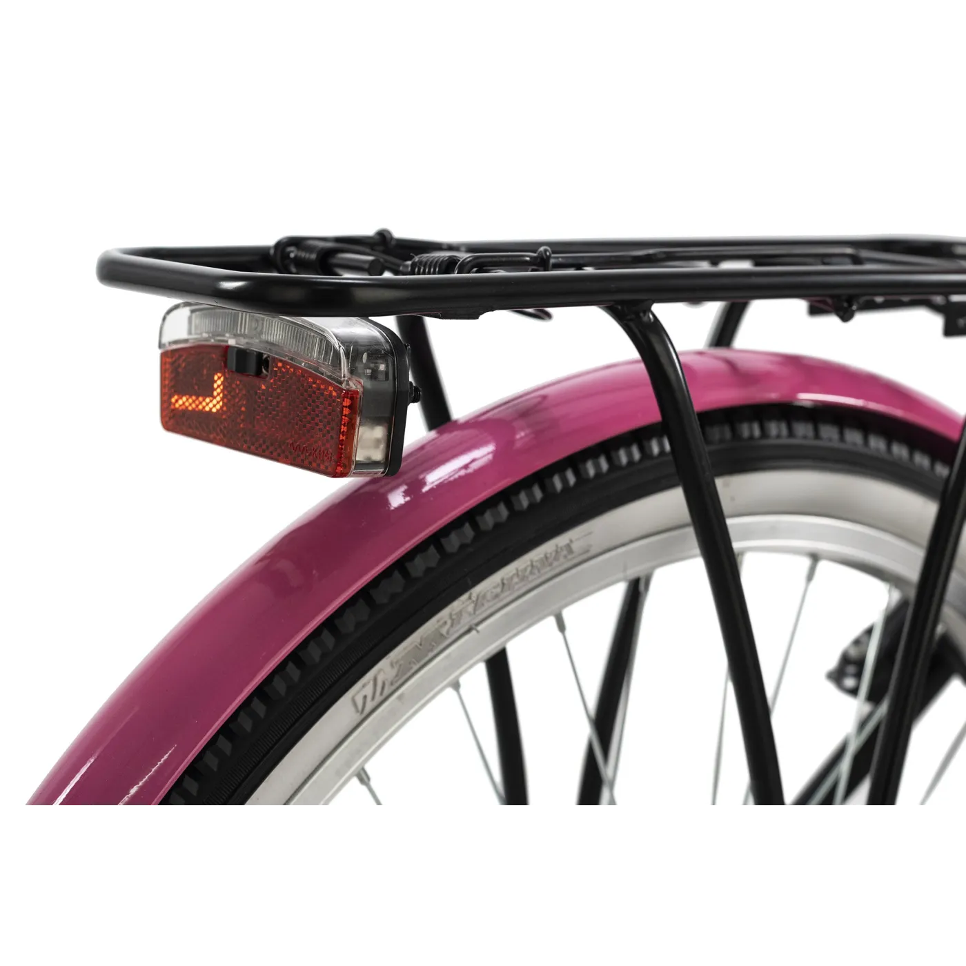 rowerze. Wyposażony w system oświetlenia oraz pełny zestaw akcesoriów niczym prawdziwy miejski jednoślad - bagażnik, osłona łańcucha, błotniki oraz stopka. Dzięki 7-biegowej przerzutce, łatwej w obsłudze rączce obrotowej i dwóm hamulcom typu V, Twoje dziecko może łatwo przyzwyczaić się do większych rowerów.