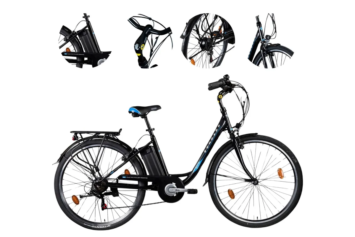 👌 Oprócz napędu elektrycznego, Z505 ma również 6-biegowy napęd łańcuchowy z przerzutką tylną z zespołu Shimano Tourney. Jest przełączany za pomocą sprawdzonego przełącznika obrotowego RevoShift. Hamulce V-brake firmy Promax na przednich i tylnych kołach zapewnią bezpieczeństwo.