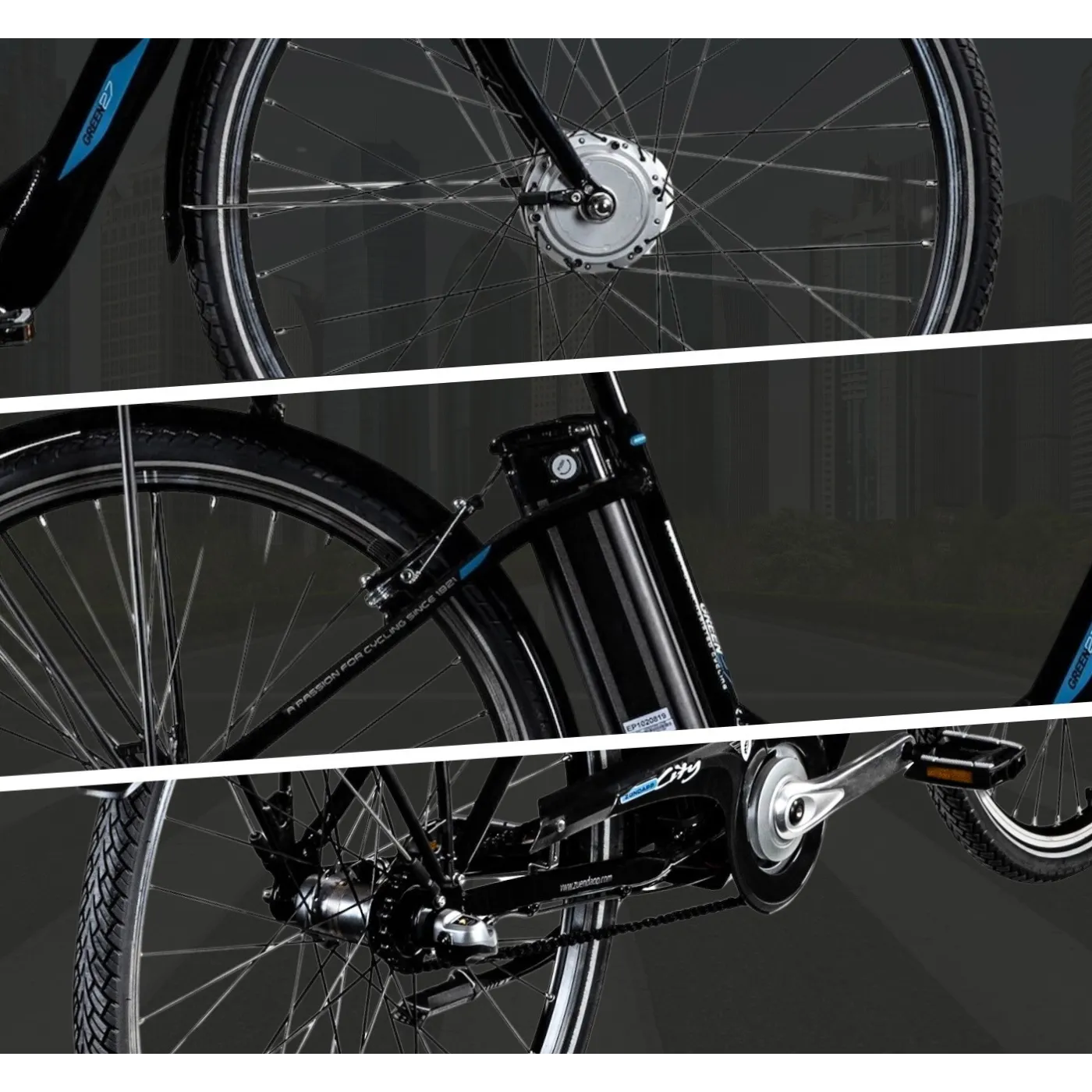 🔋Silnik w piaście koła przedniego zapewnia mocne i ciche wsparcie na drodze. Dzięki mocy 250 watów zapewnia duży napęd do 25 km/h. Dodatkowo, bateria o mocy 374,4 Wh pozwoli Ci pokonać nawet do 115 km!