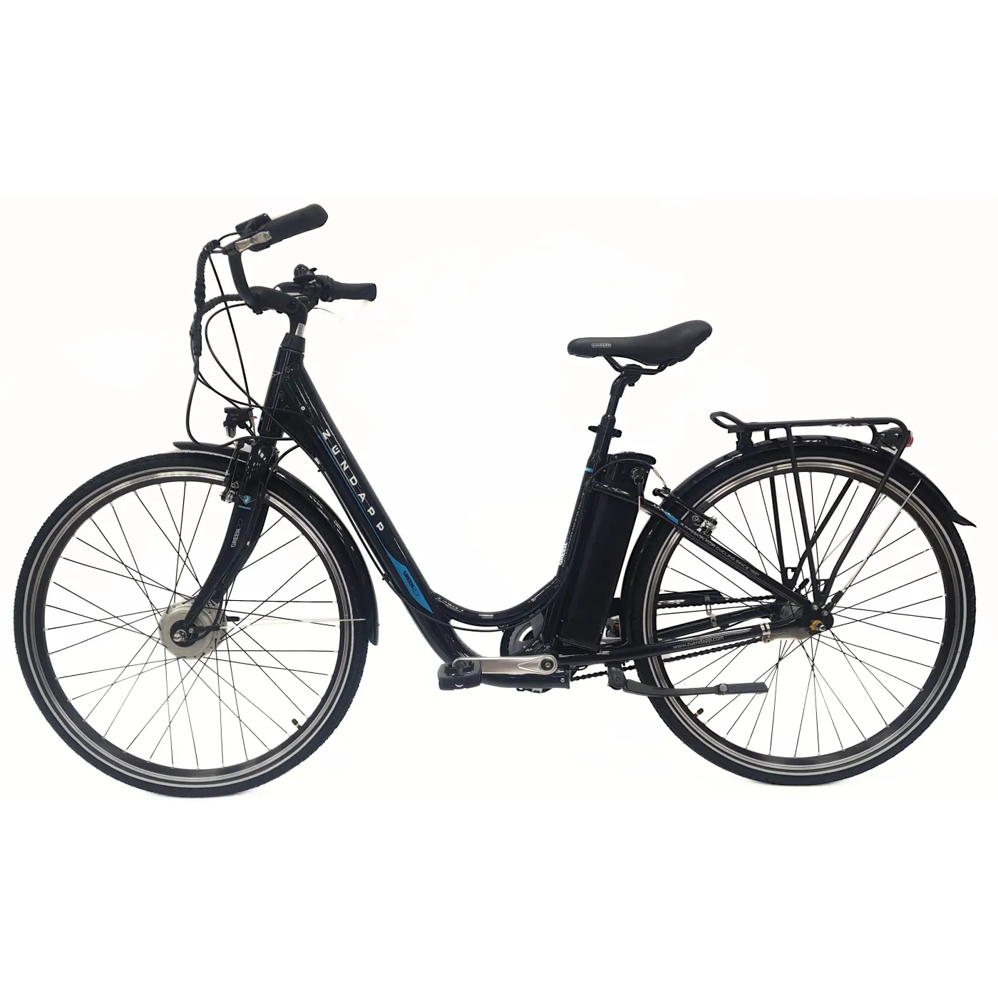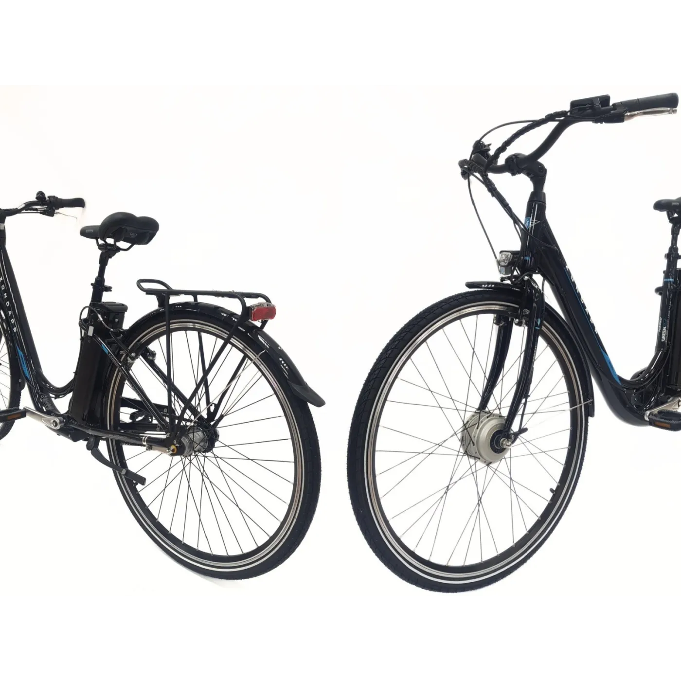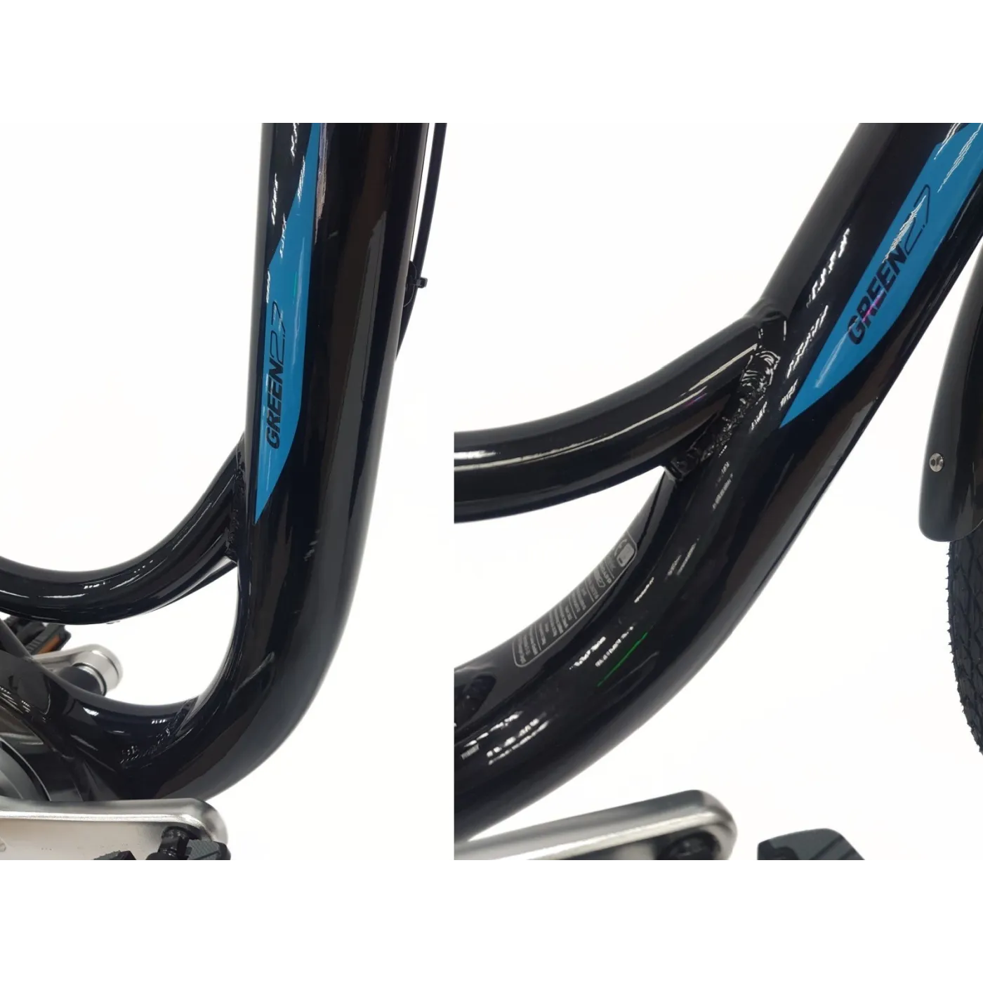 ⚖️ Podstawową konstrukcją tego roweru jest lekka aluminiowa rama. Niski przekrok ułatwia wyważenie roweru oraz bezproblemowe wsiadanie i zsiadanie z roweru. Nawet osoby o ograniczonej sprawności ruchowej mogą wygodnie korzystać z tego e-roweru. Pionowa pozycja siedząca, wspierana przez obróconą do tyłu kierownicę miejską, zapewnia dobrą widoczność na drodze i prawie Cię nie męczy.