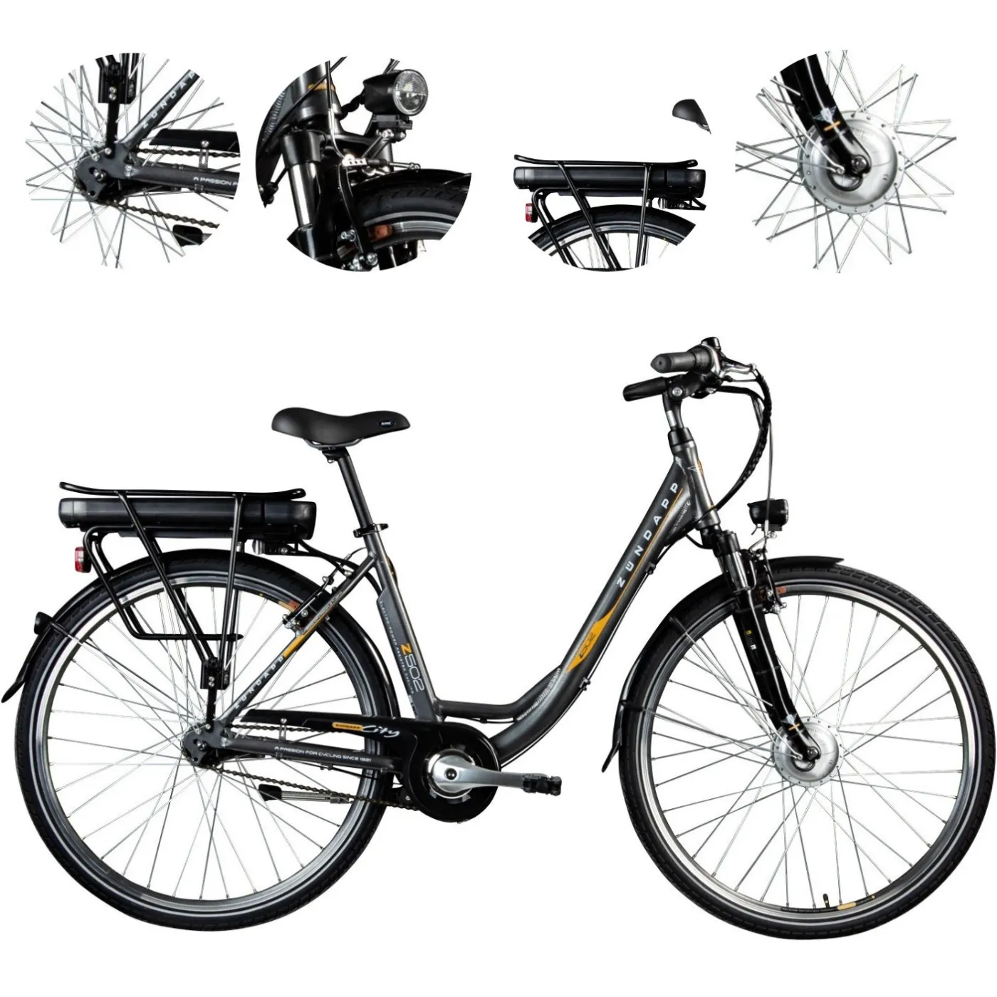 🚲 Damski rower elektryczny Zundapp Z502 to prawdziwy mistrz miejskich tras, stworzony z myślą o nowoczesnych kobietach, które cenią zarówno komfort, jak i styl. Ten elegancki jednoślad w kolorze ciemnoszarym z wyrazistymi pomarańczowymi akcentami nie tylko przyciąga wzrok, ale również zachwyca funkcjonalnością na najwyższym poziomie. Jego lekka, a zarazem wytrzymała rama aluminiowa gwarantuje optymalne prowadzenie i łatwość w manewrowaniu, co czyni go idealnym wyborem do codziennego poruszania się po miejskiej dżungli.