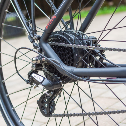 Napęd oparty na komponentach SHIMANO Altus 3x8 oferuje 24 biegi, co pozwala bardzo precyzyjnie dopasować przełożenia do stylu jazdy, podjazdów oraz spokojniejszych odcinków pokonywanych ze wspomaganiem elektrycznym. Taki zakres napędu dobrze sprawdza się w rowerze trekkingowym, gdzie liczy się wszechstronność i wygoda.