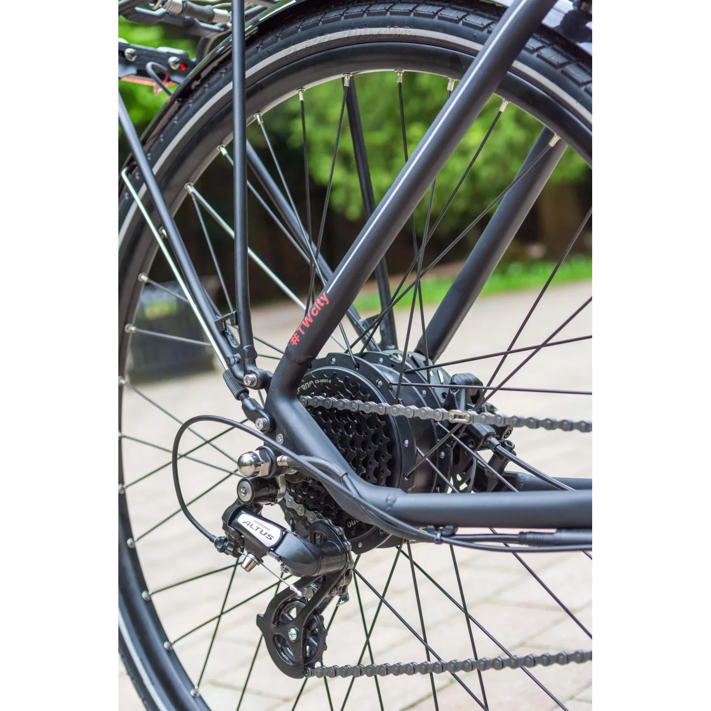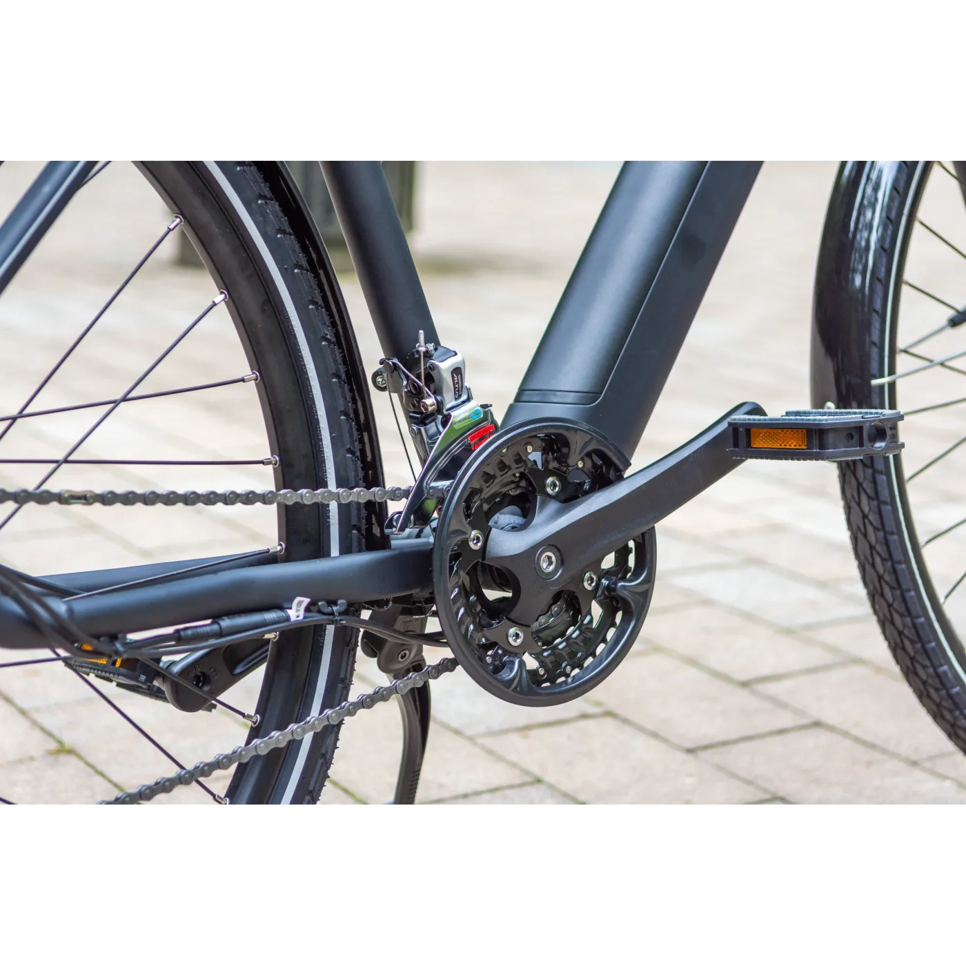 Silnik Ananda M145 36 V 250 W 50 Nm, umieszczony w tylnej piaście, oferuje dynamiczne i jednocześnie bardzo ciche wspomaganie. Dzięki temu rower płynnie przyspiesza, ułatwia ruszanie oraz pomaga utrzymać komfortowe tempo jazdy bez nadmiernego wysiłku.