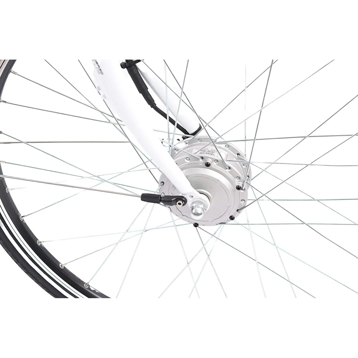 To elektryczny rower miejski, który z pewnością spodoba się zarówno kobietom jak i mężczyznom, który szukają wytrzymałego roweru w dobrej cenie. Jego charakterystyczna niska rama, wygodne miejskie siodełko oraz wspomaganie elektryczne sprawiają, że jazda na nim to czysta przyjemność. Doskonały towarzysz w drodze do pracy, na zakupy czy na codzienne lub weekendowe przejażdżki. Wyposażony w silnik o mocy 250W, dzięki czemu jazda pod górę nie będzie od teraz sprawiać większego wysiłku.
