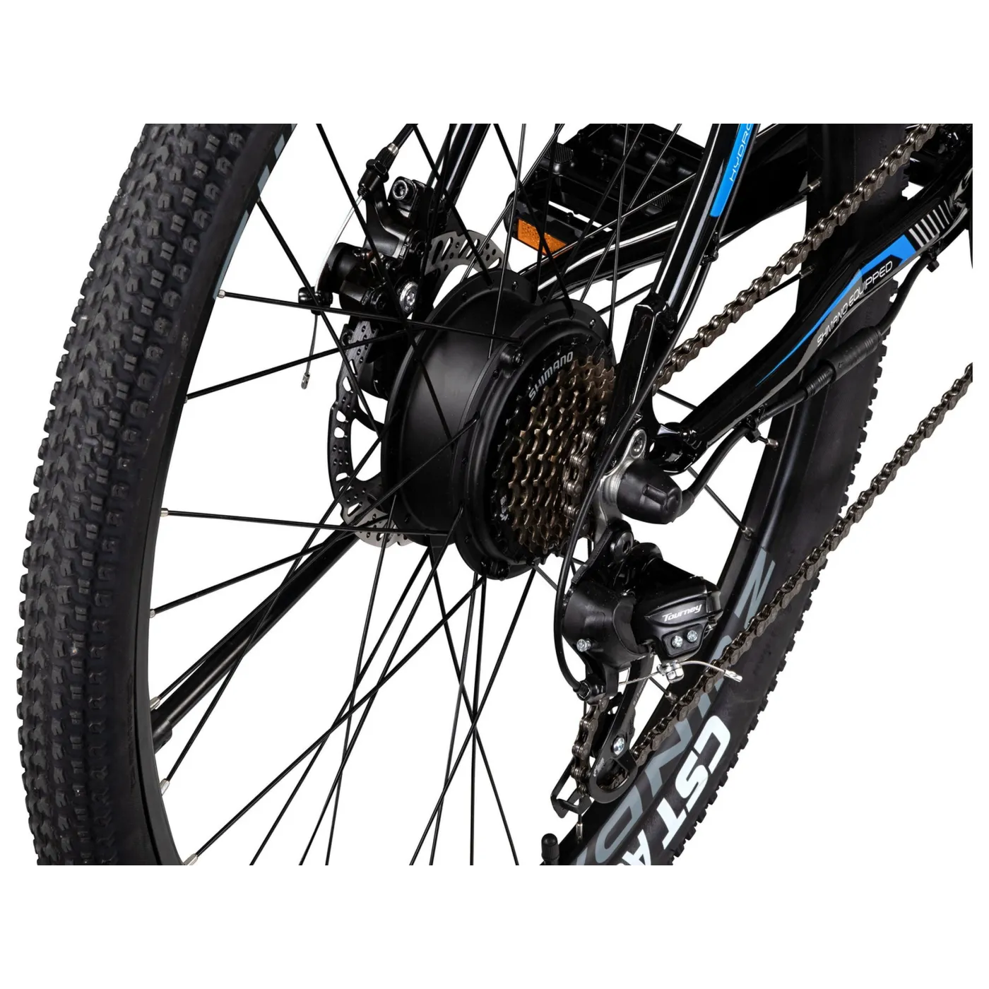✔️ E-rower ma również napęd łańcuchowy. Jeśli chcesz jeździć bez silnika, możesz zrobić duże postępy. Zamontowano tylną przerzutkę Shimano, mechanizm korbowy firmy Prowheel i łańcuch KMC X8. Biegi można łatwo wybierać za pomocą dźwigni zmiany biegów Shimano Tourney. W porównaniu z hamulcami obręczowymi, mechaniczne hamulce tarczowe mają tę zaletę, że na ich skuteczności hamowania nie ma wpływu brud i wilgoć. Dlatego są używane głównie w rowerach górskich, które również lubią jeździć po drogach poza utwardzonymi drogami.