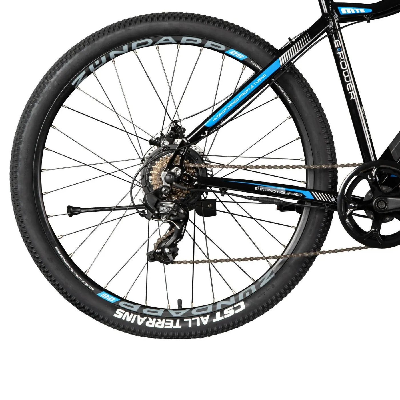 E-rower ma również napęd łańcuchowy. Jeśli chcesz jeździć bez silnika, możesz zrobić duże postępy. Zamontowano tylną przerzutkę Shimano Tourney, mechanizm korbowy firmy Prowheel i łańcuch KMC X8. Biegi można łatwo wybierać za pomocą dźwigni zmiany biegów Shimano Tourney.