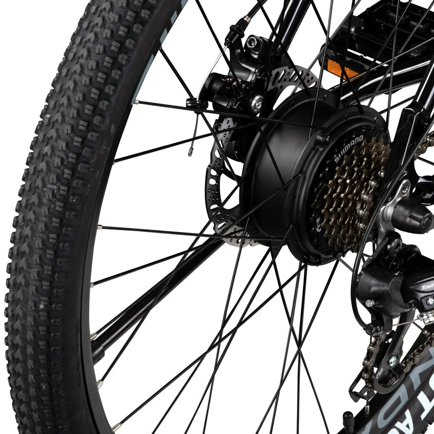 E-rower ma również napęd łańcuchowy. Jeśli chcesz jeździć bez silnika, możesz zrobić duże postępy. Zamontowano tylną przerzutkę Shimano Tourney, mechanizm korbowy firmy Prowheel i łańcuch KMC X8. Biegi można łatwo wybierać za pomocą dźwigni zmiany biegów Shimano Tourney.