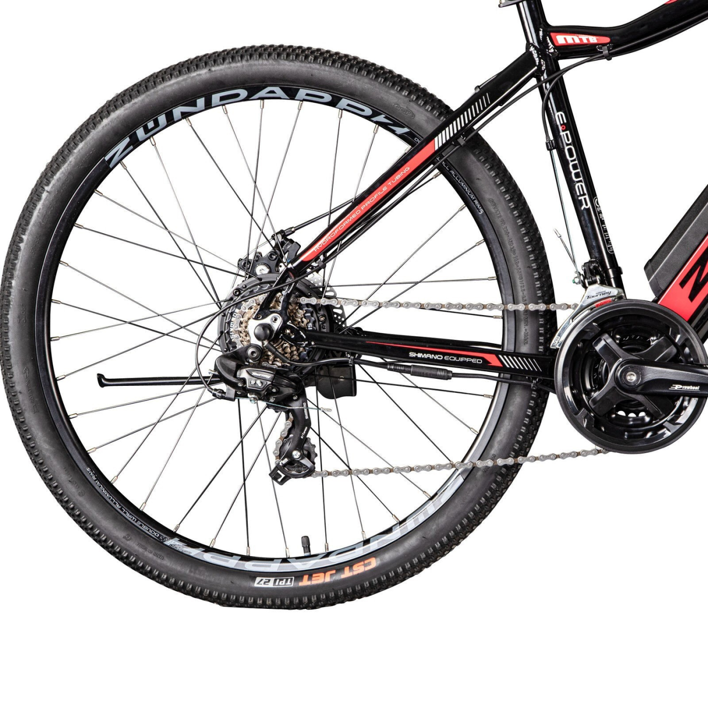 E-rower ma również napęd łańcuchowy. Jeśli chcesz jeździć bez silnika, możesz zrobić duże postępy. Zamontowano tylną przerzutkę Shimano Tourney, mechanizm korbowy firmy Prowheel i łańcuch KMC X8. Biegi można łatwo wybierać za pomocą dźwigni zmiany biegów Shimano Tourney.